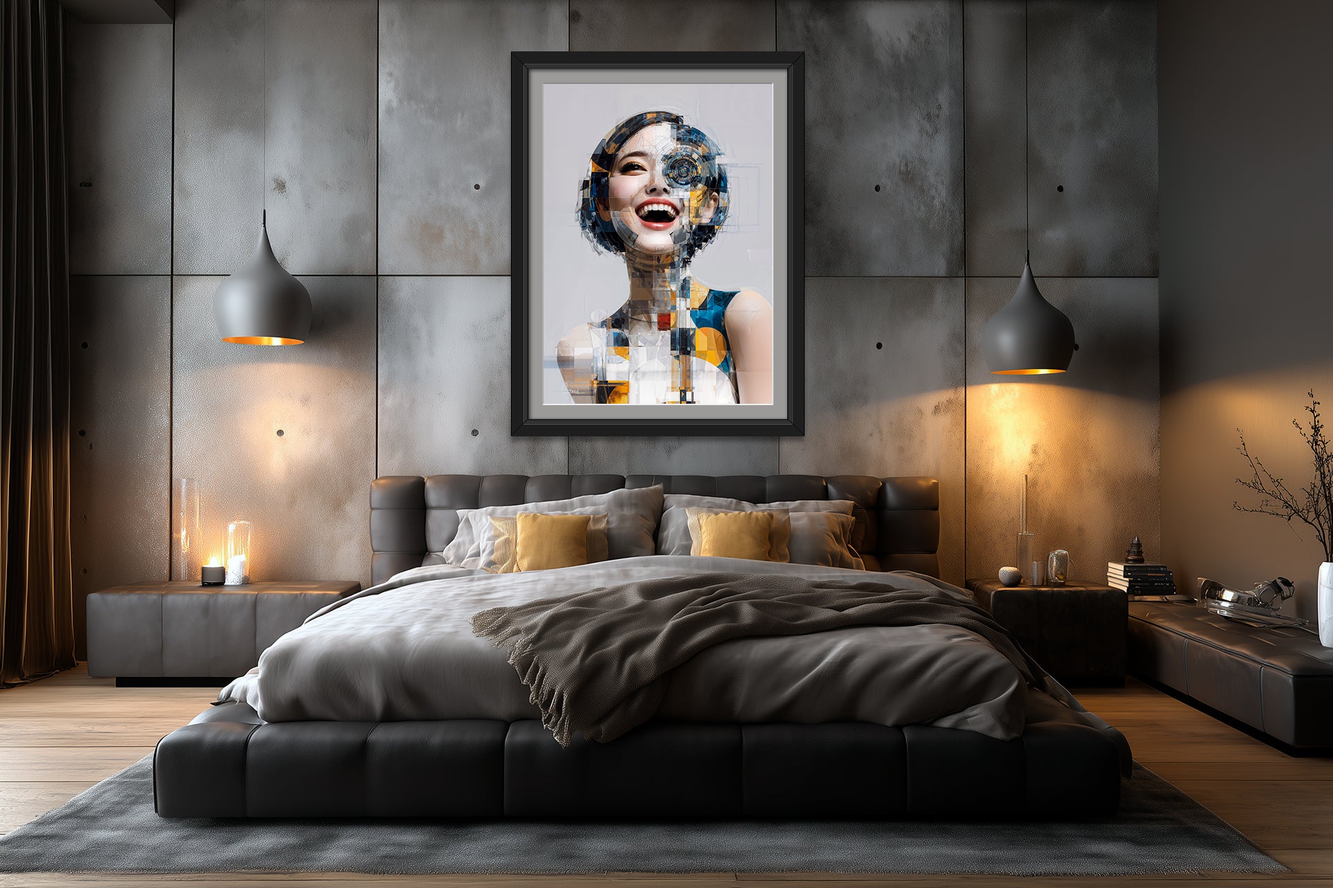 "A Terrible Beauty No. 32" – Abstract planes weave through the composition, balancing bold industrial geometry with the organic curve of a joyous human face. Her laughter is timeless, captured in layers of geometry and alloy, celebrating the fusion of warmth and circuitry in a luminous palette.