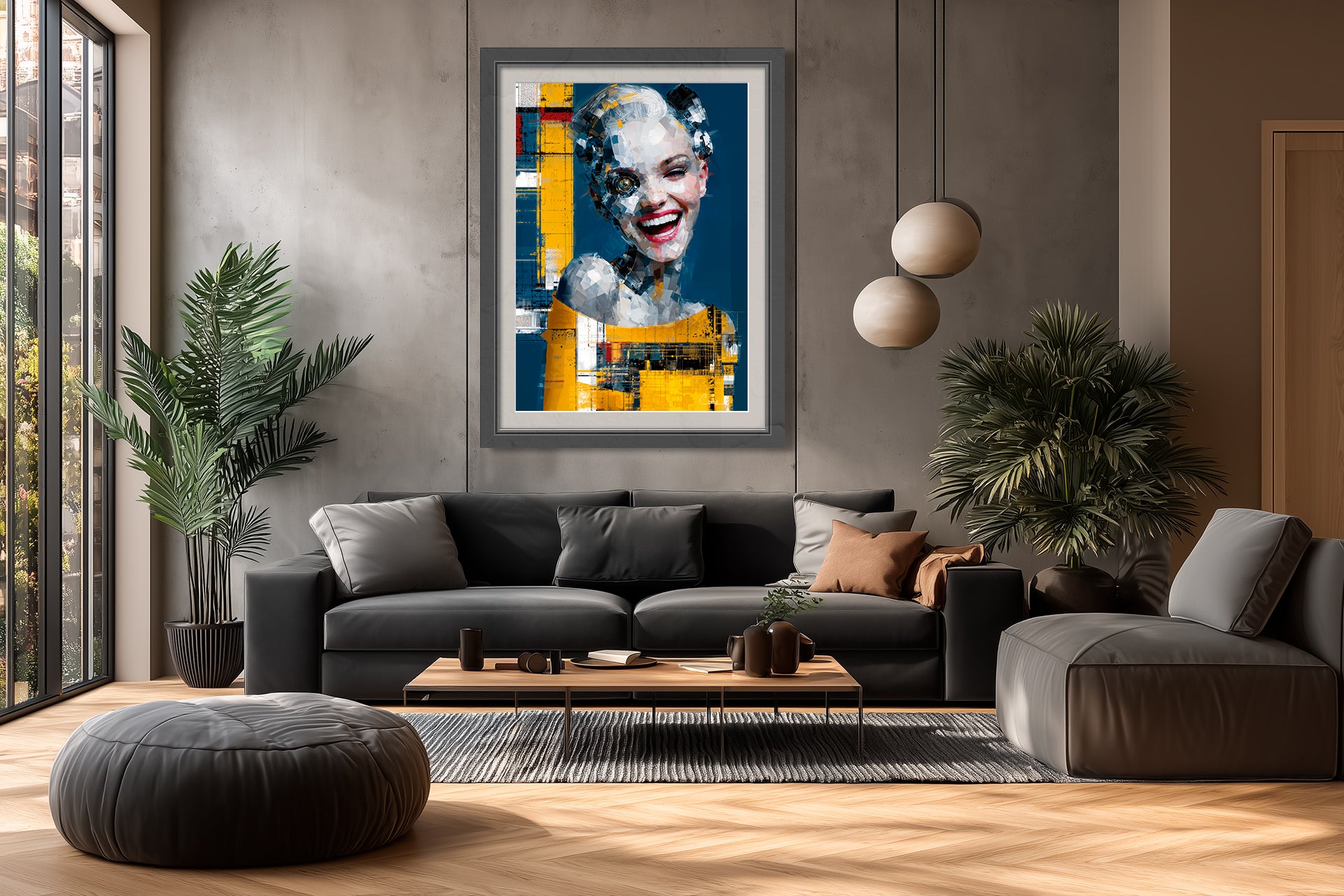 "A Terrible Beauty No. 7" – Future Vogue. This portrait radiates vibrancy, a mechanical beauty with a cinematic grin, captured in geometric abstraction. The perfect balance of retro-futuristic glamour and digital precision.
