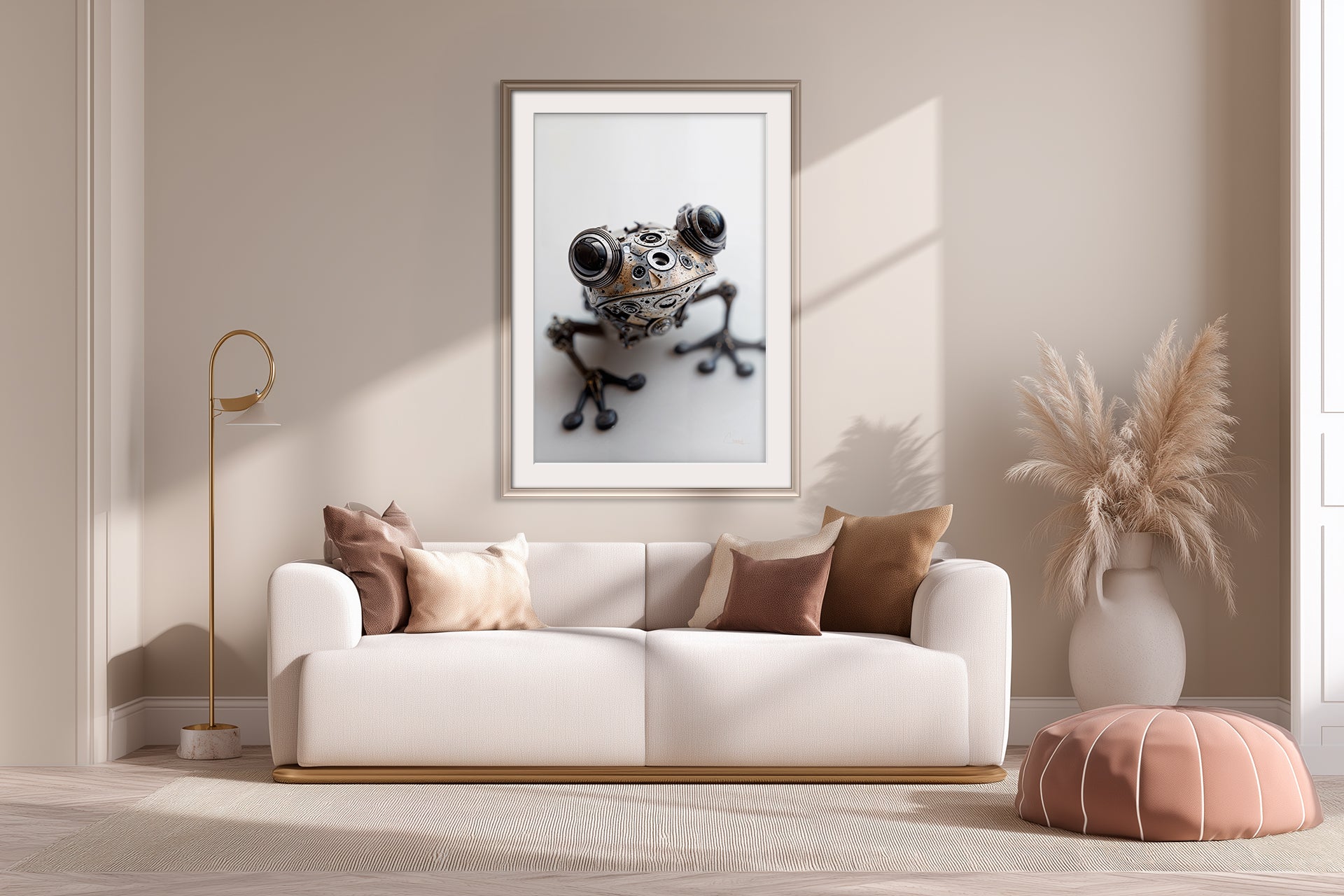 "Amphibia Machina No. 7" – Curious Cyber Toad. A whimsical robotic frog with oversized optical lenses, blending curiosity and mechanical charm.