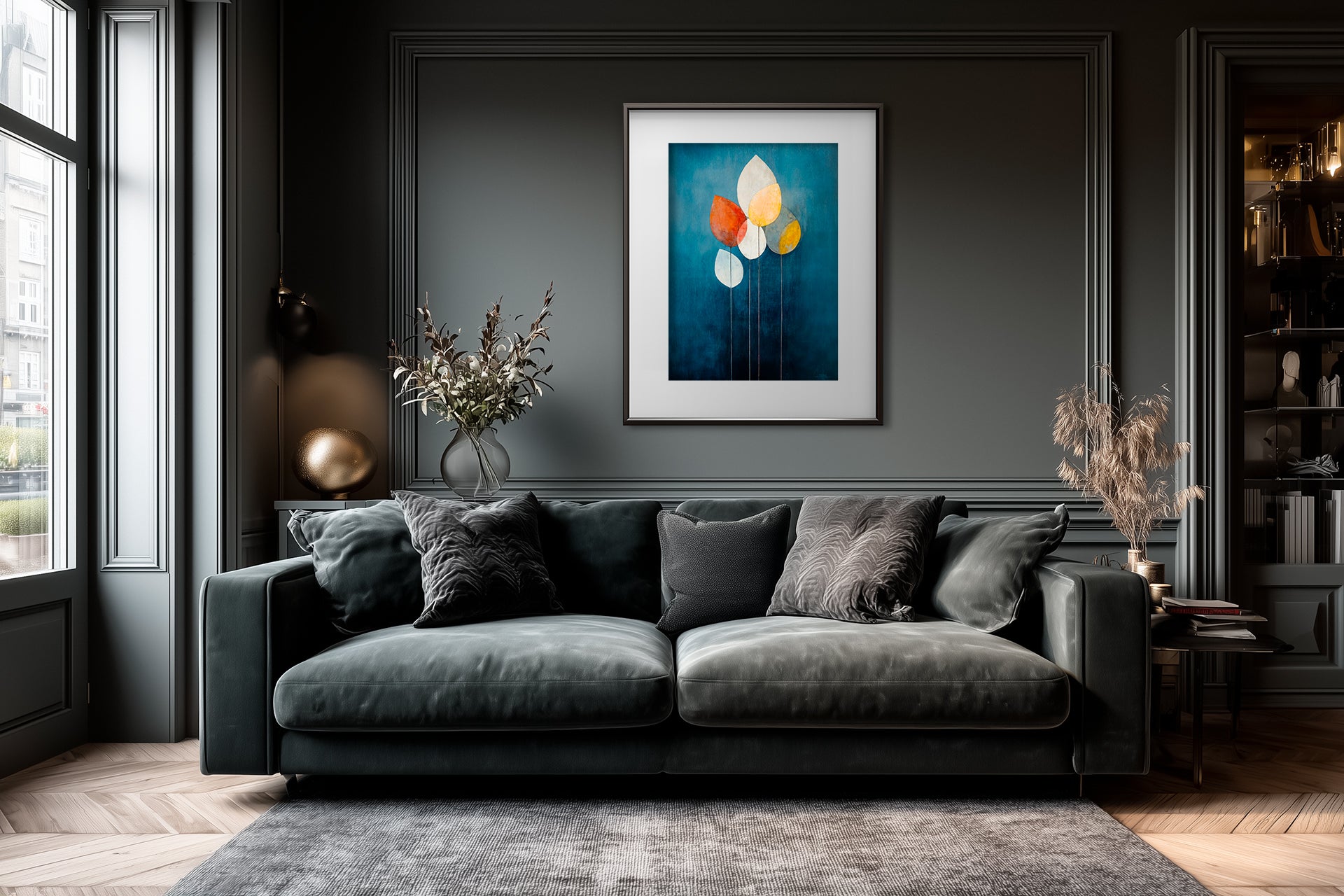 "Autumn leaves No. 1" – Echoes of Fall. Autumn leaves No. 1 distills the quiet beauty of nature into geometric simplicity. Six leaves stand tall against a deep blue field, their colors glowing in autumnal tones of gold, orange, and cream. A serene contribution to Nature Reimagined: Abstract Forms, this piece celebrates balance and stillness.