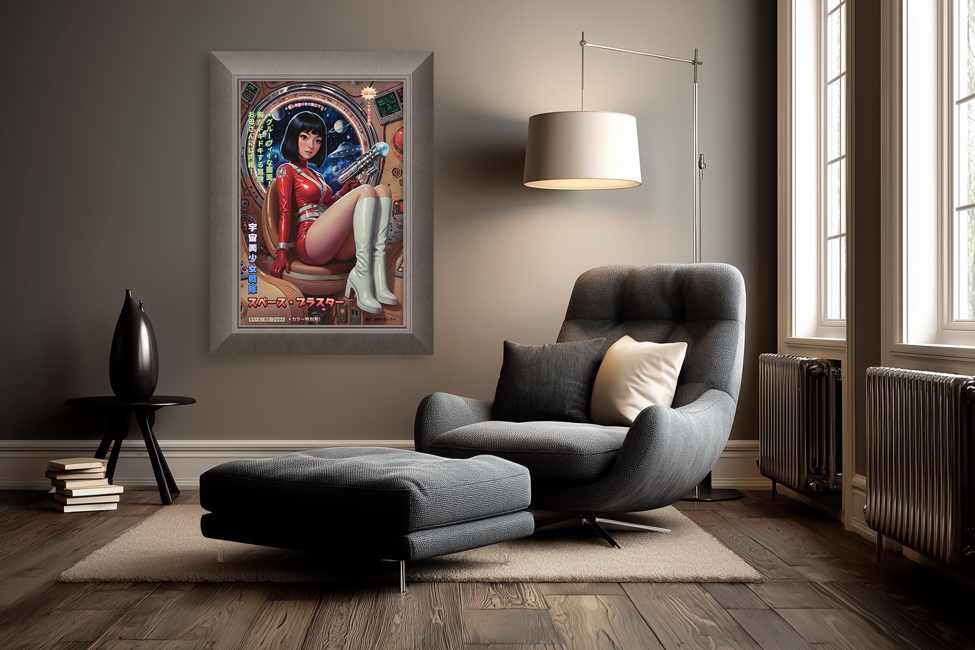 This piece radiates a tongue-in-cheek homage to the “space sirens” of 1960s Japanese and American sci-fi art. It merges painterly realism with comic-book sensibility—combining the sheen of Barbarella, the crisp precision of Thunderbirds, and the color-grading of vintage magazine covers. The tactile details—the stitching on her suit, the embossed insignia, the glow of analog dials—transform nostalgia into a lush, cinematic portrait. Babes’n Blasters Vol. 10 is both a love letter to pop futurism and a wry celebration of pulp-era spectacle, where the cosmos was just another stage for beauty and bravado.