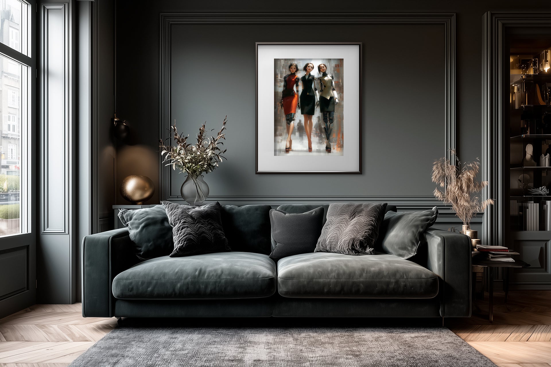 "City Girls No. 1" – Cybernetic Elegance. Three striking figures stride through the city with flawless grace, their robotic prosthetics seamlessly integrated into high-fashion silhouettes. Their confident expressions and tailored couture blur the line between woman and machine, presenting a vision of beauty amplified by technology.