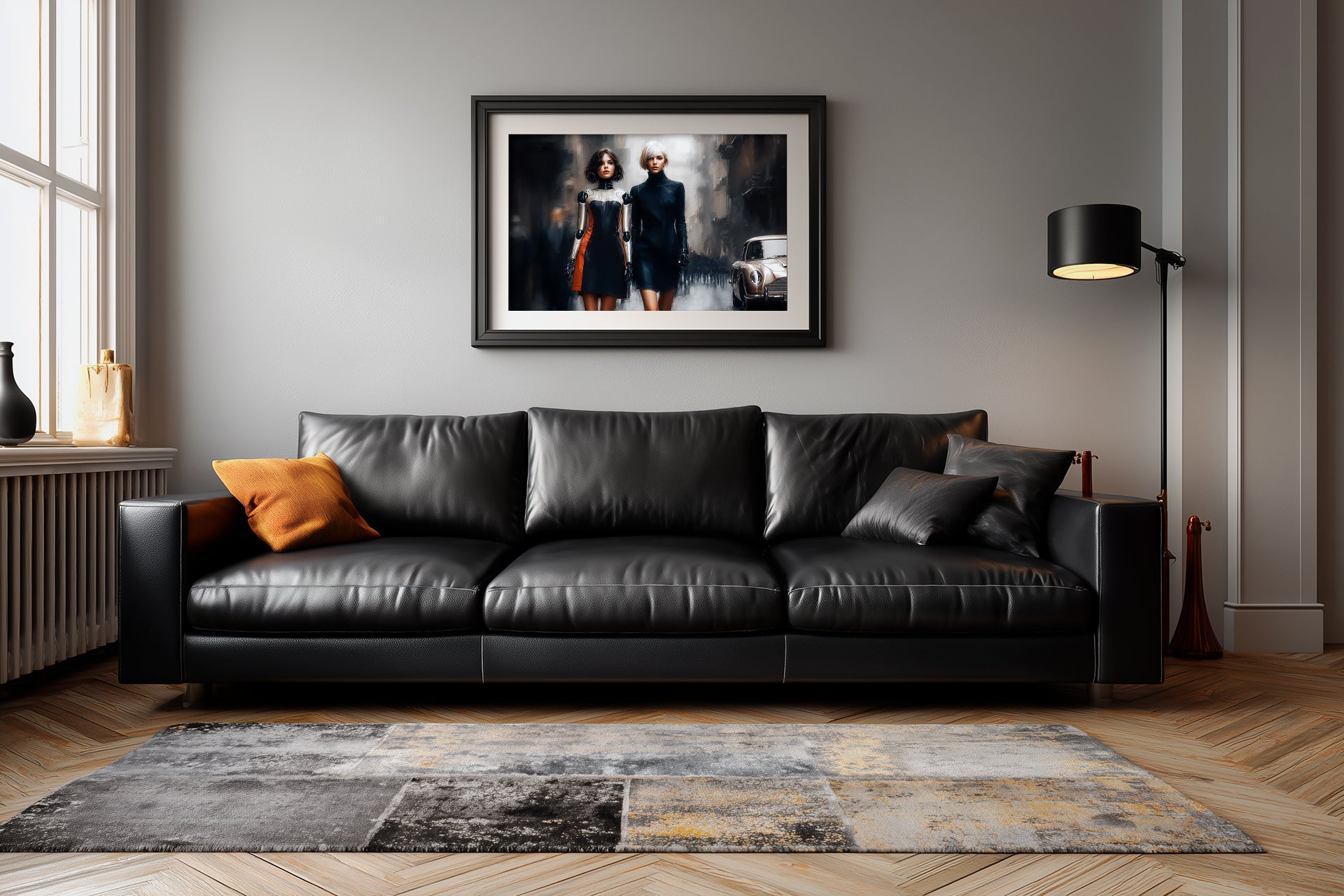 Art Style: Retro-futurist noir — muted palette, dramatic shadows, and the juxtaposition of vintage automobiles with cybernetic fashion gives this a timeless-meets-futuristic edge.
