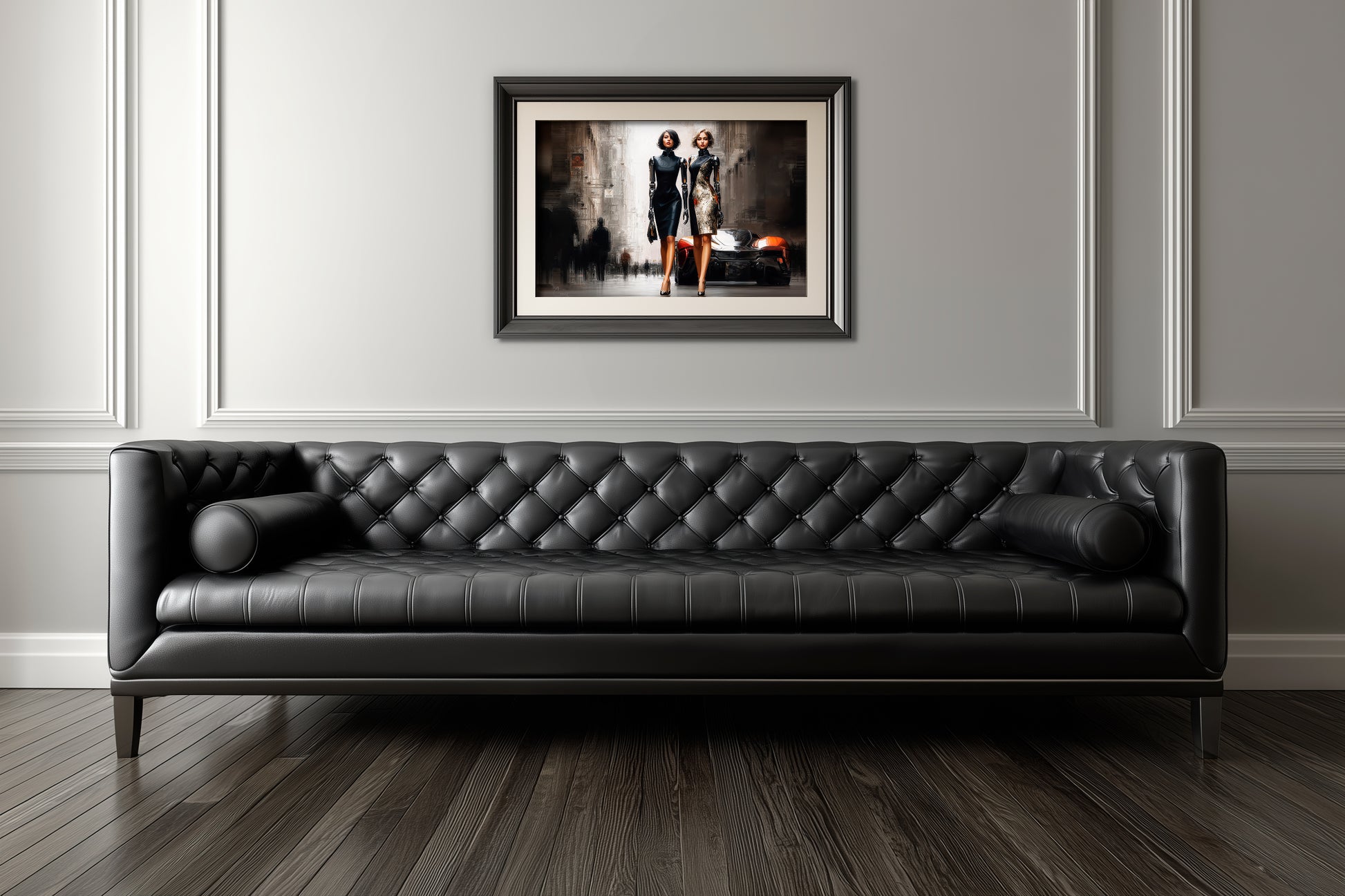 "City Girls No. 8" – Luxury in Motion. Against the gleaming silhouette of a futuristic supercar, two women walk side by side in tailored dresses, their prosthetic arms gleaming like jewelry. Together they embody speed, elegance, and technological seduction.