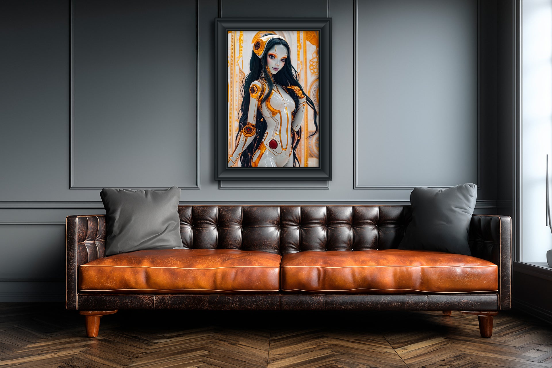 "Cyborg Siren No. 11" – This cyborg’s sharp orange-gold accents and glowing eyes contrast with her alabaster skin, giving her the presence of a queenly courtesan. Both alluring and imperious, she embodies eros engineered into perfection, a living fantasy of technology’s power to seduce.