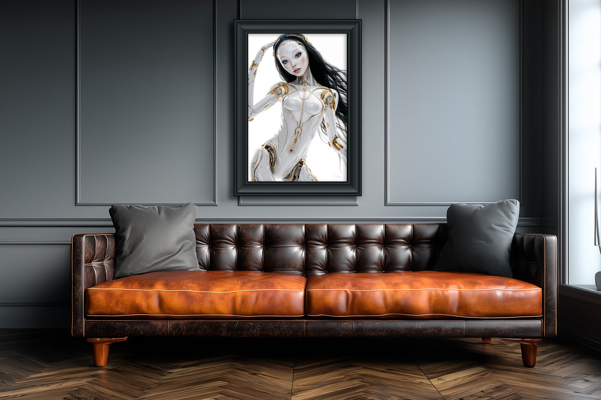 "Cyborg Siren No. 3" – With flawless ivory plating and golden seams tracing her curves, this cyborg seems poised between awareness and invitation. Her eyes, rendered with painterly delicacy, draw the viewer into an intimate dialogue—a machine designed to be both muse and mystery.