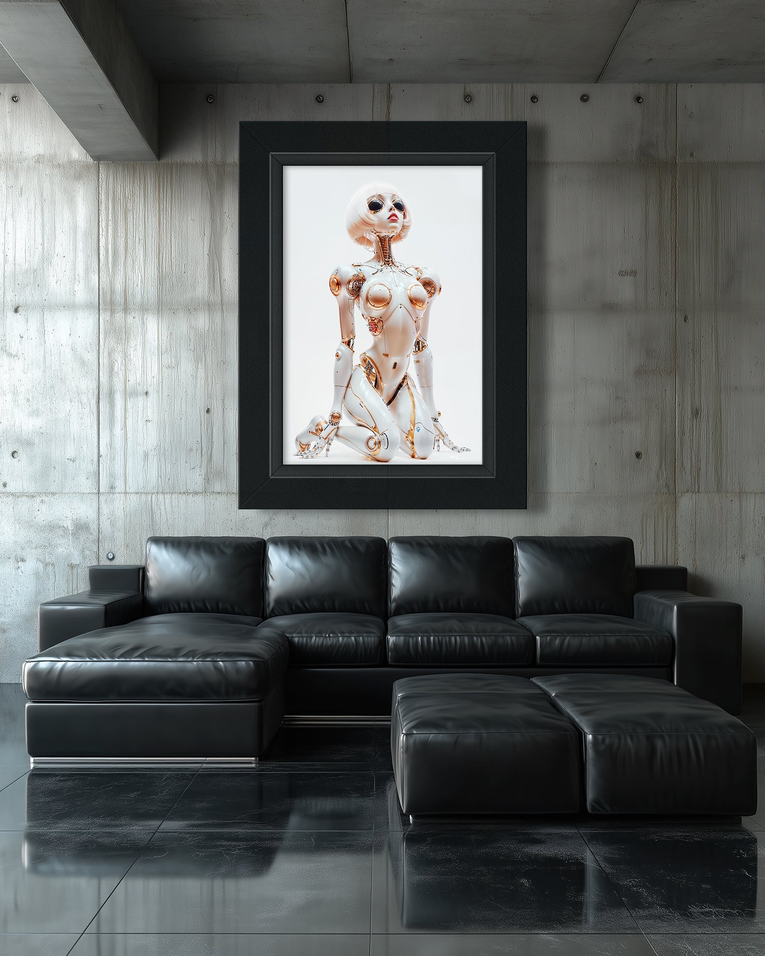 "Cyborg Siren No. 7" – Exquisite Gynoid. A kneeling cyborg in stark white and polished gold evokes both submission and strength. Her insect-like black eyes and perfectly coiffed bob haircut shift her away from the human spectrum—emphasizing the alien allure of erotic robotics.