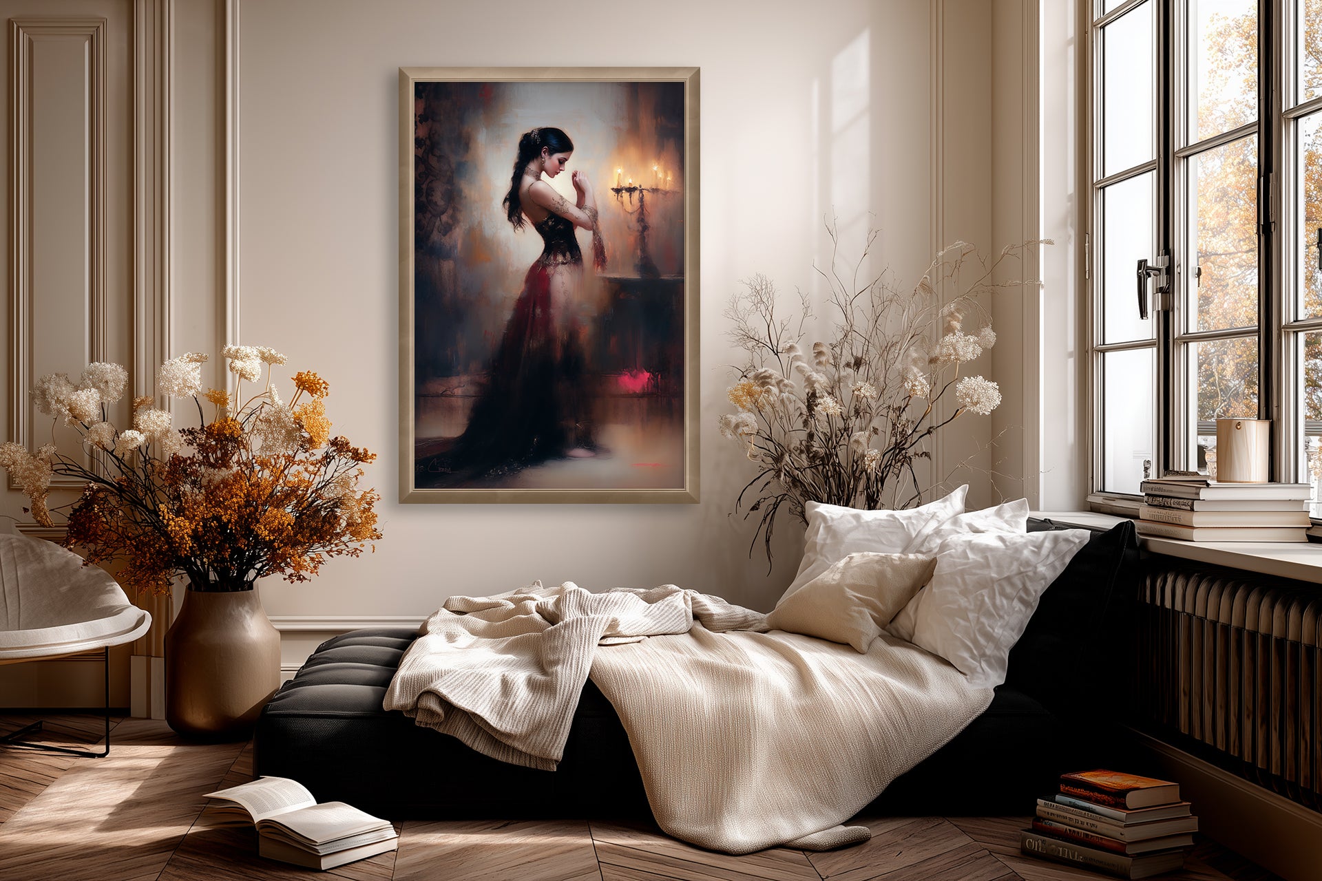 "Dancing in the dark No. 1" – This piece portrays a solitary dancer in an intimate moment of reflection, her hands raised as though in prayer, framed by the golden flicker of candlelight. Her gown of deep crimson and black cascades downward like smoke, merging with the darkness itself. A vision of grace caught between devotion and seduction, she embodies the timeless ritual of preparing to dance.