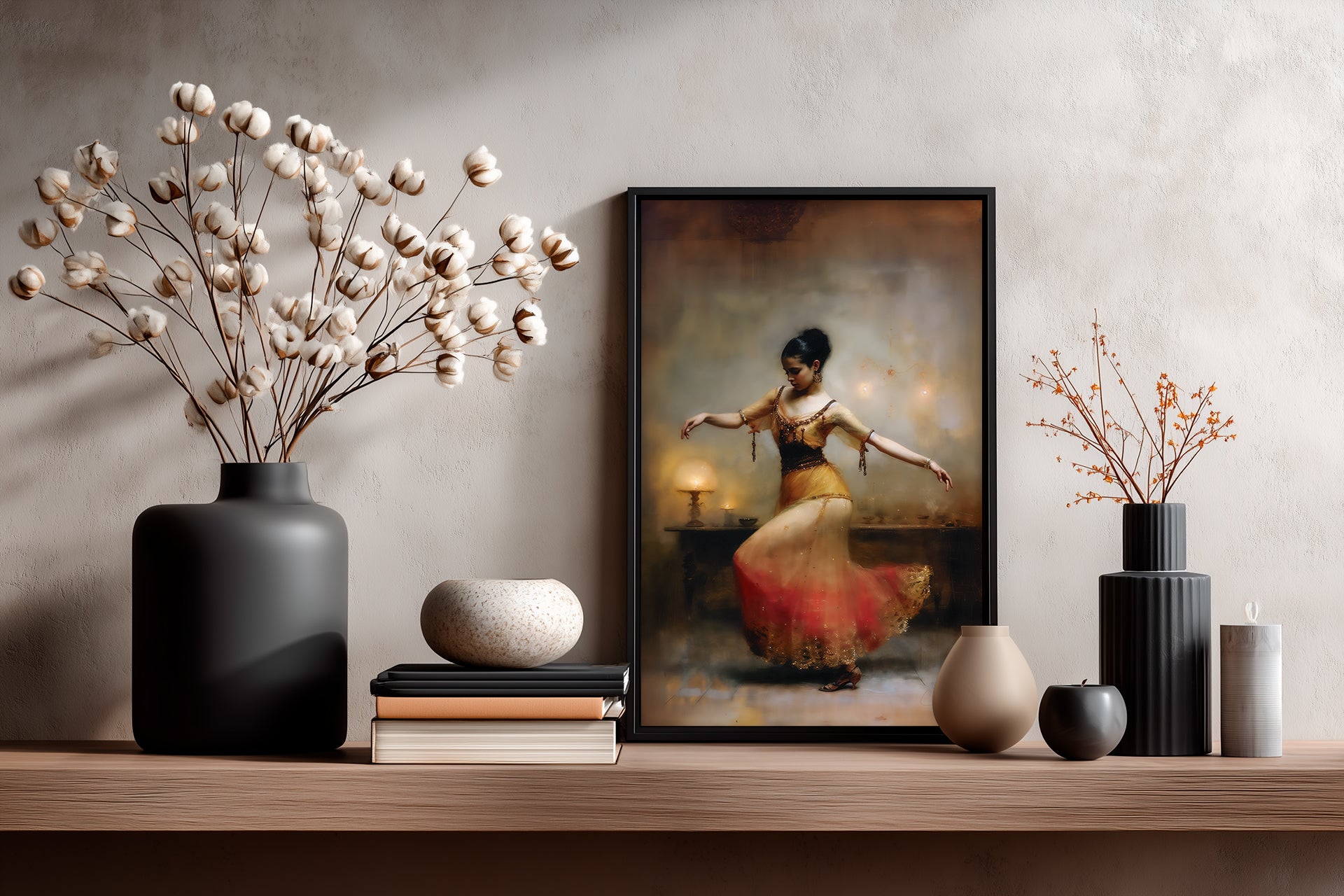 "Dancing in the dark No. 6" – Swathed in warm amber and red, this dancer bends gracefully as if listening to the music of a vanished court. The glowing lamps behind her blur into a halo of gold, heightening the sense that this is a dream plucked from an Old Testament parable or a lost Arabian night.