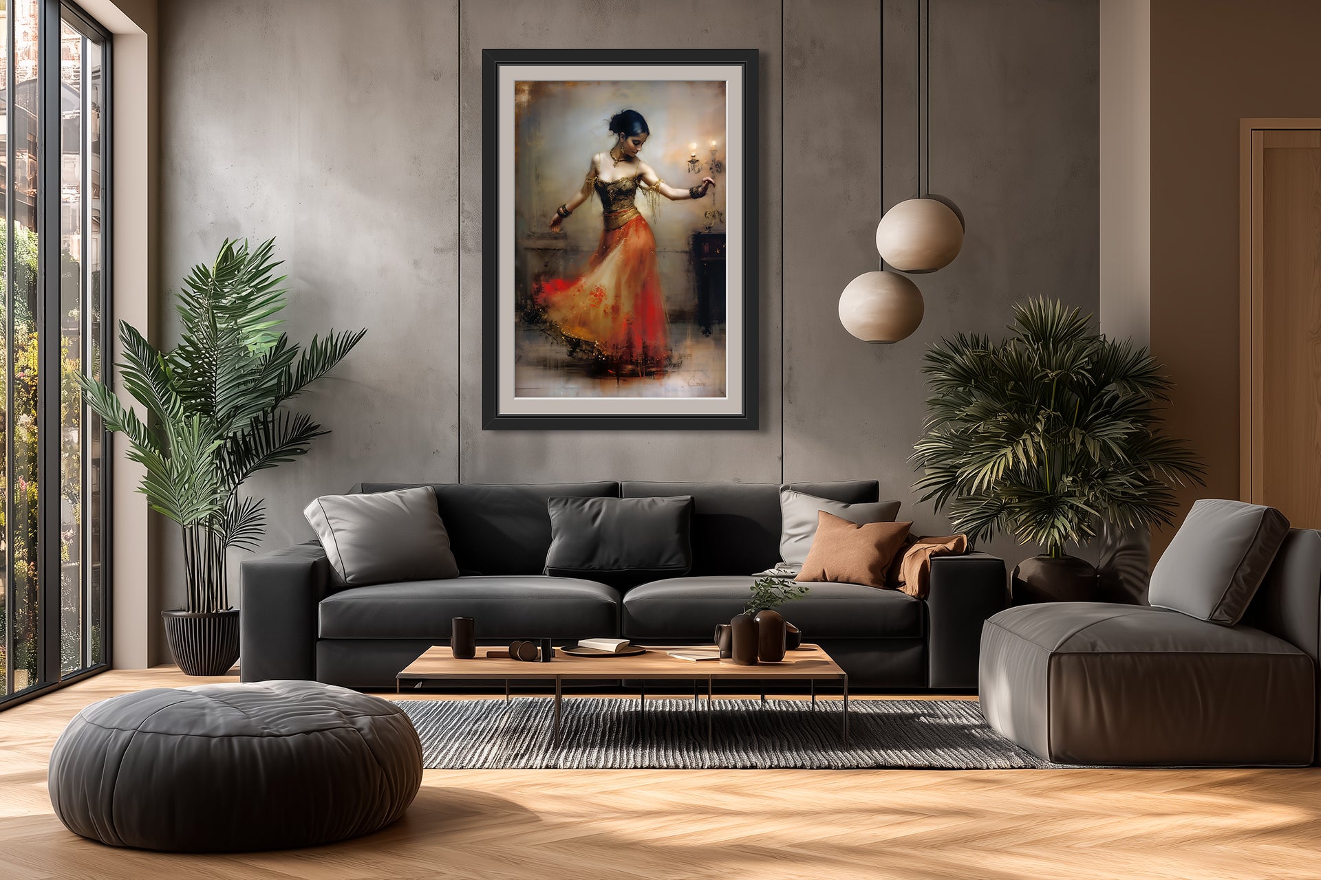 "Dancing in the dark No. 7" – With a flowing skirt of crimson and gold, this dancer spins in a blur of color, her arms poised like a goddess of rhythm. The fabric swirls like embers, radiant against the darkness. This piece captures both the fiery power and delicate vulnerability of the dance.