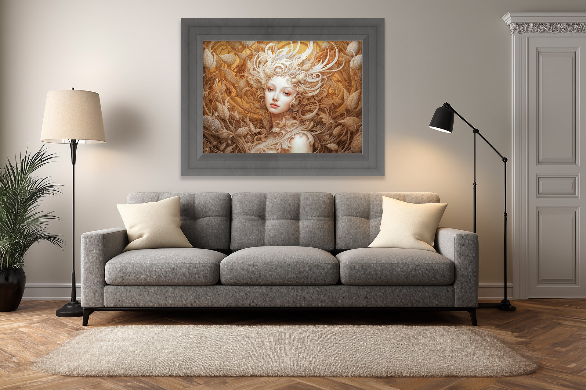 "Dark Fantasy No. 13 – Daughter of the Harvest. Crowned with curling blossoms and seed pods, this nymph emerges as both maiden and harvest queen. She carries the dual promise of abundance and sacrifice.