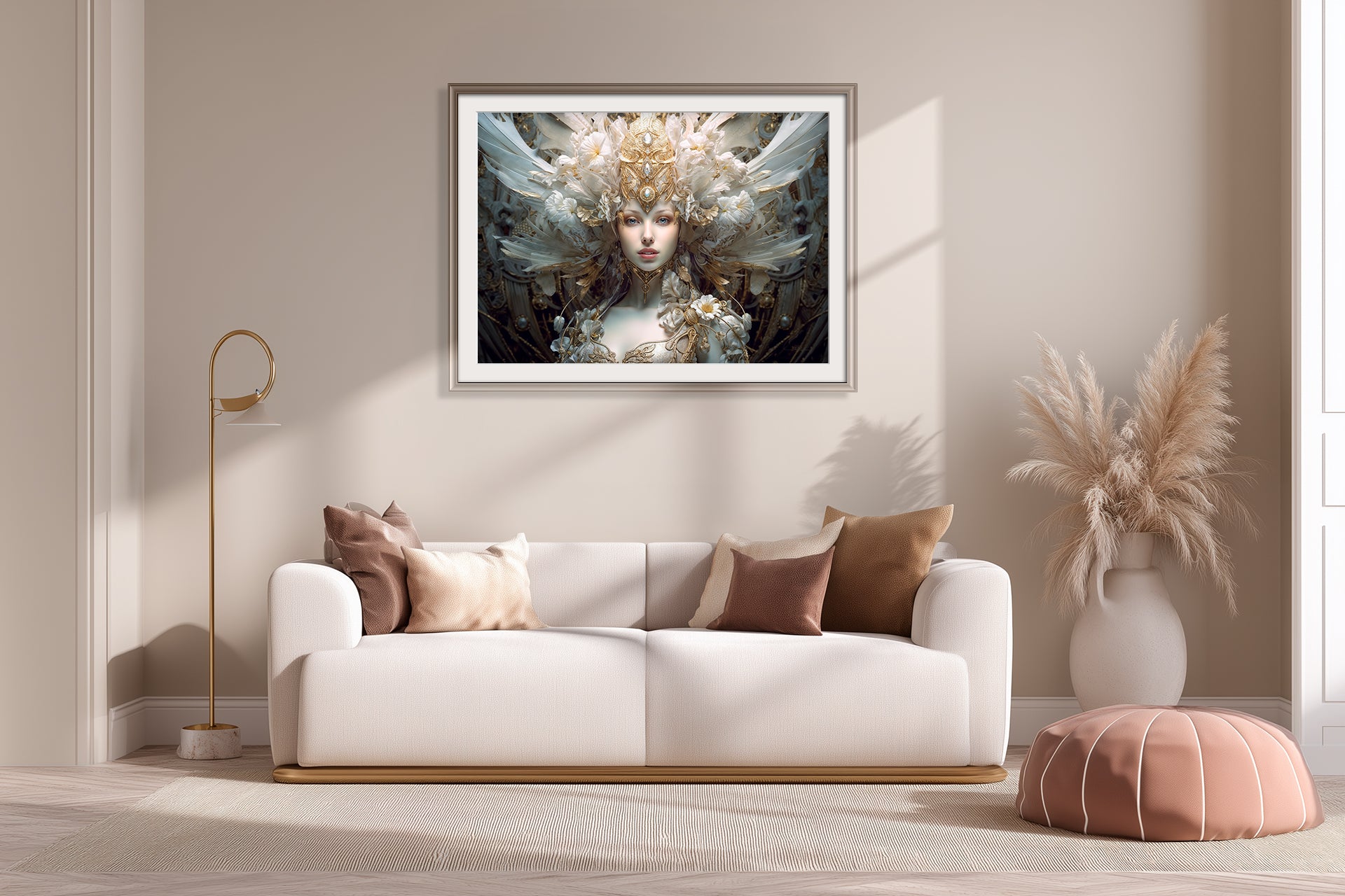 "Dark Fantasy No. 14" – The Ivory Empress. Resplendent in white and gold, crowned with plumes and jewels, she radiates divine authority. Her presence suggests a queen whose rule extends into both heaven and shadow.