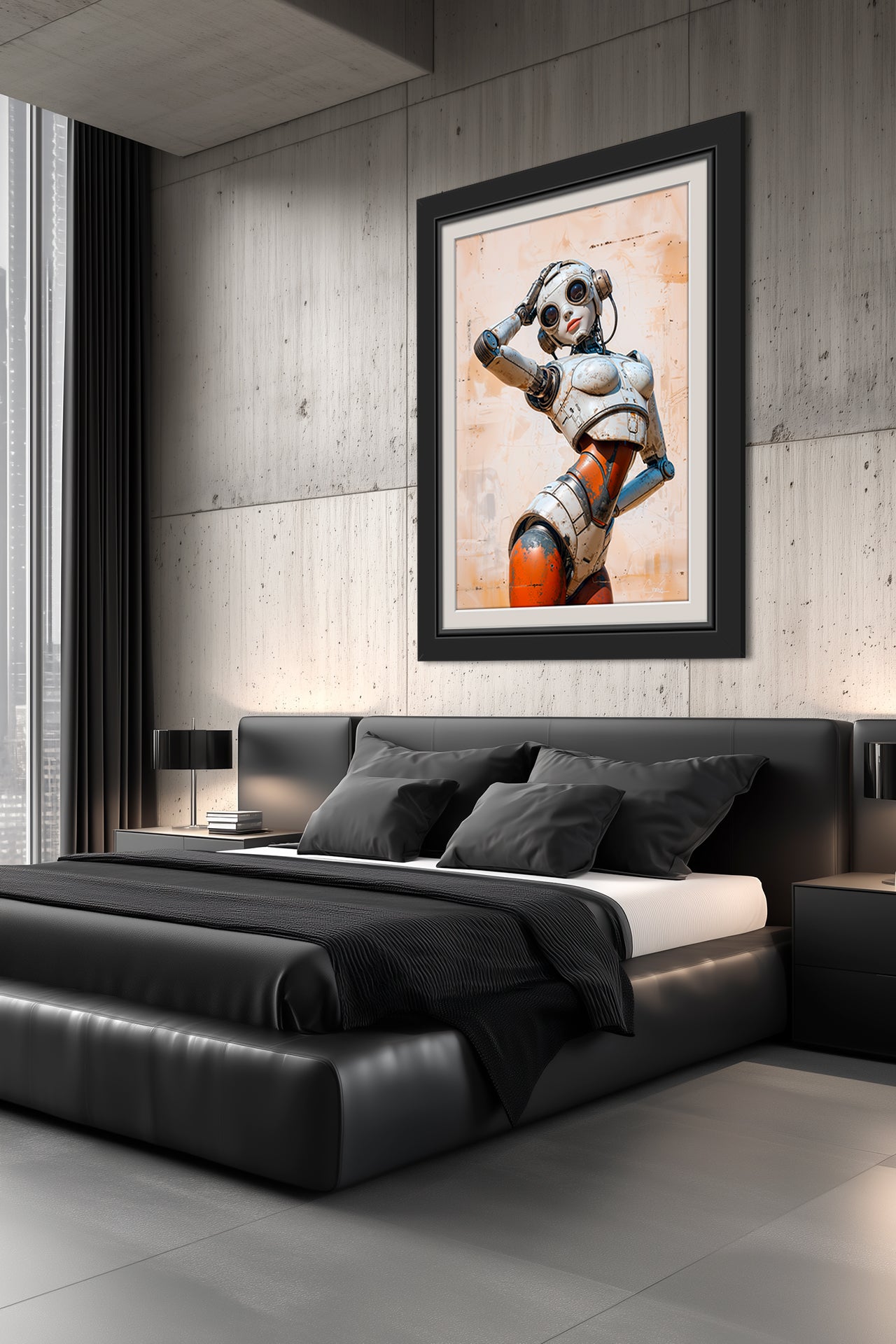Art Style: This piece is a striking example of retrofuturism fused with industrial sci-fi aesthetics. The stylization borrows from classic 20th-century pin-up poses, reimagined through robotics and cybernetic textures. Weathered metal plating, rivets, and scuffed paint lend authenticity, while the soft human-like facial details introduce a surreal tension between machine and muse. The result is a bold, cinematic work that feels equal parts vintage illustration and modern digital concept art.