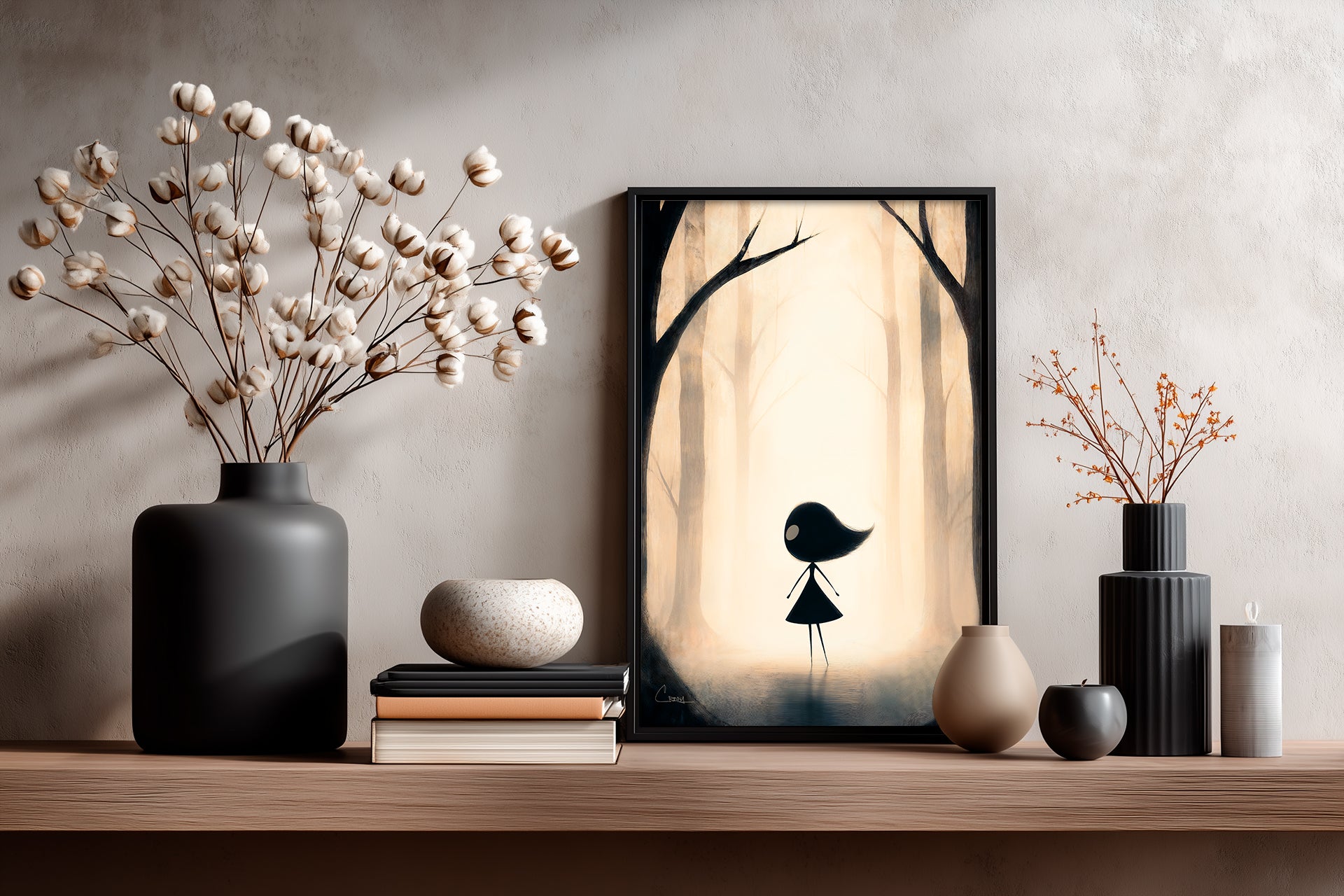 "Echoes in the Shadowwood" – In a pale forest, a shadow-girl stands small against looming trunks. Innocence bends toward menace here, as if the woods themselves are watching.