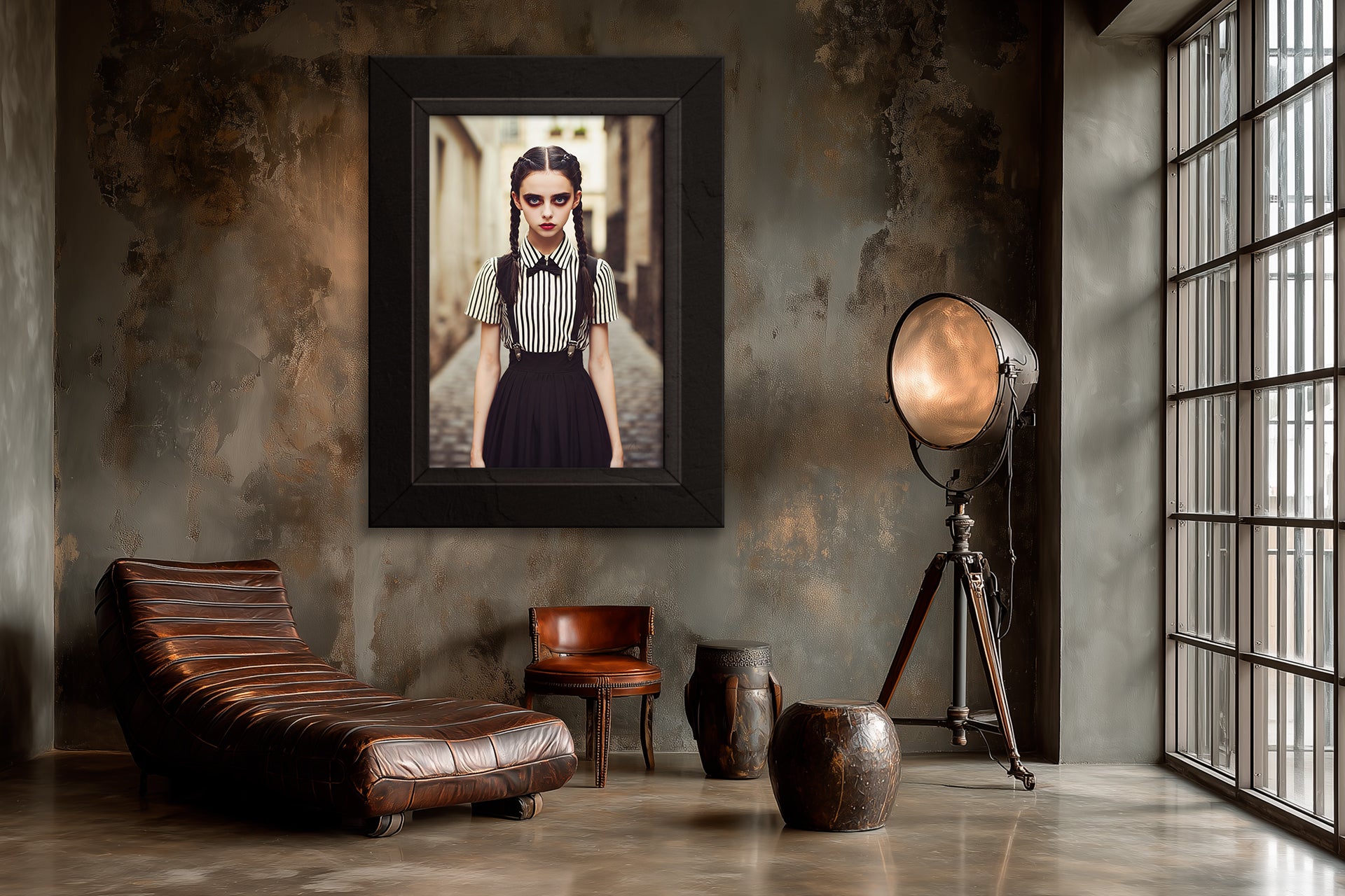 "Gothilicious No. 2" – Striped Shadows. A young woman with twin braids and a fierce gaze stands in a narrow cobblestone street, her striped blouse and black skirt creating a sharp contrast against the soft blur of the background. Her expression, poised between defiance and allure, is framed by immaculate braids and a bow tie that hints at vintage formality.