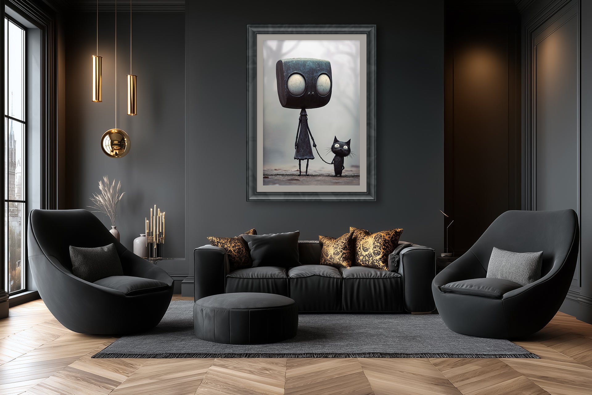 Art Style: Digital surrealism with muted palette, clean detailing, Tim Burton–inspired proportions.