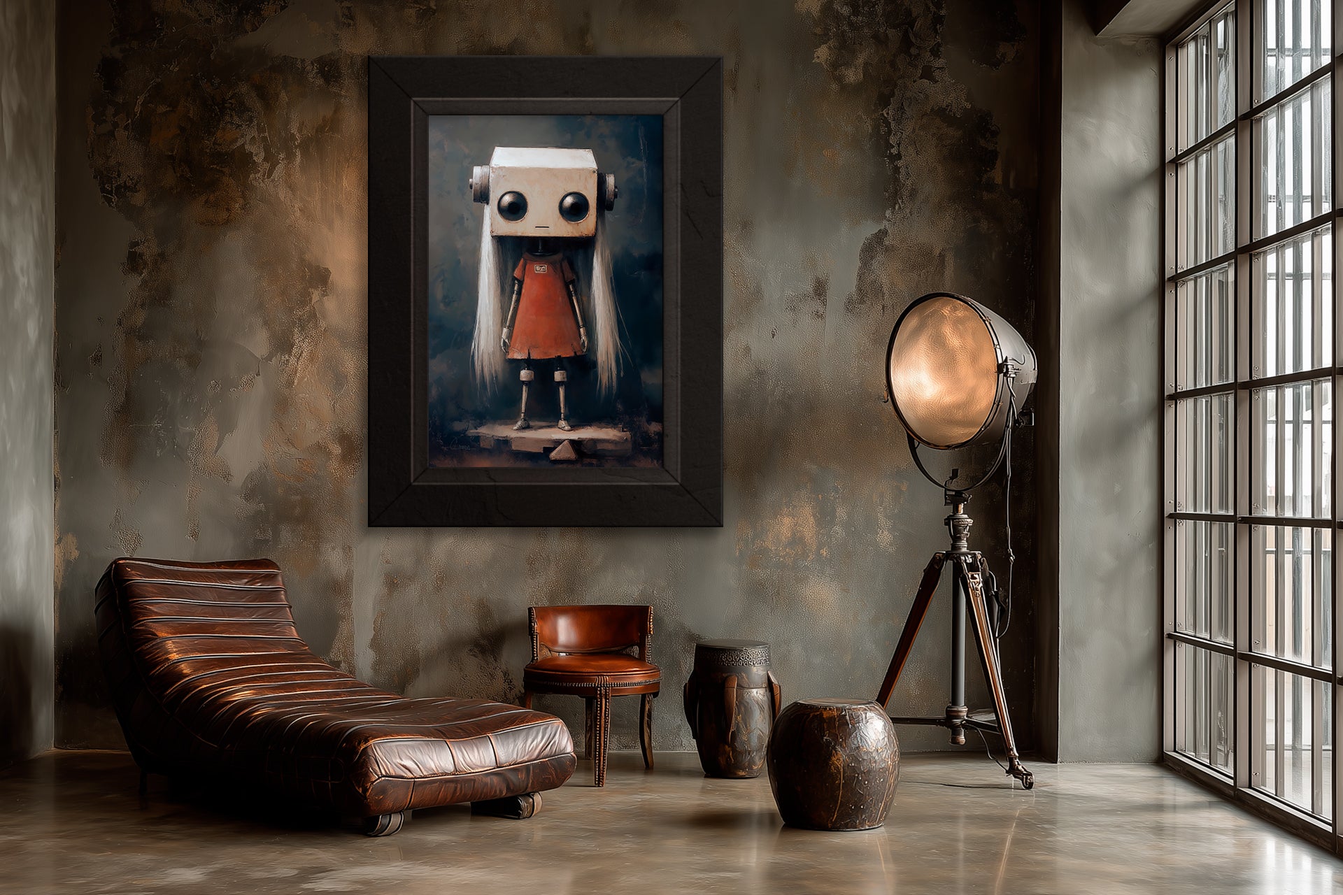 "It is okay to be different No. 10" – A square-headed robot child, clad in a worn red dress, gazes ahead with quiet resignation. Long strands of white hair spill over her shoulders, softening the otherwise harsh geometry of her mechanical frame. This painting captures both innocence and strangeness, the delicate balance between machine logic and human vulnerability.