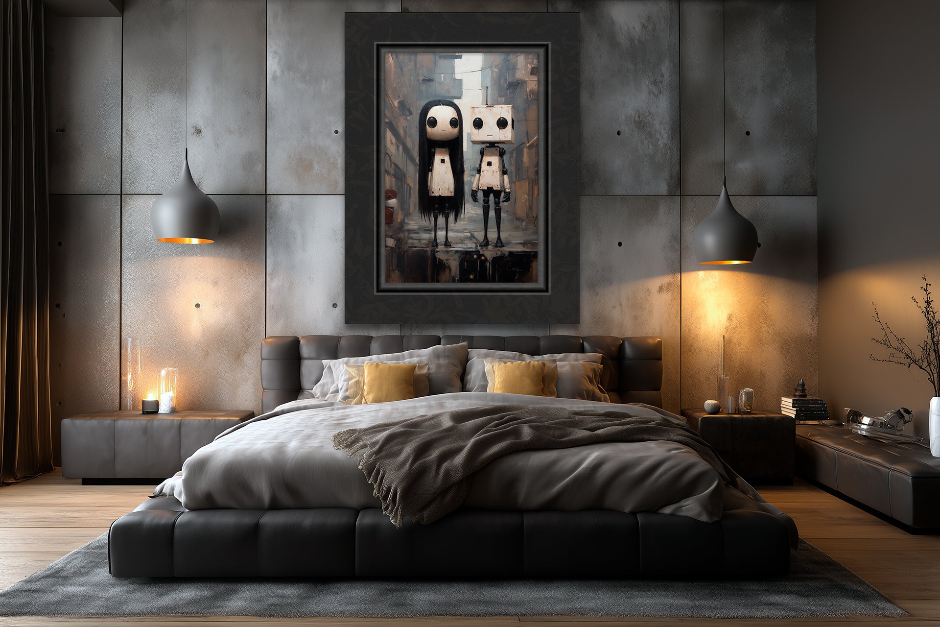 "It is okay to be different No. 13" – This duet of robots, one with long hair and the other square-headed with an antenna, stand as companions against a backdrop of worn city walls. Their blank stares and upright postures suggest both solidarity and loneliness. The work reflects themes of friendship, survival, and belonging in a world that feels both strange and familiar.