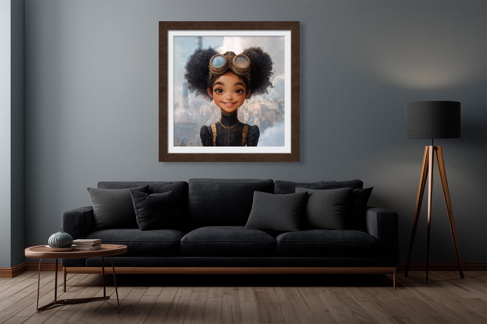 "Little Steampunk No. 13" – Smile like you built the sky: Joy in every turn of the cog. With a radiant smile and intricate gear-shaped curls, this steampunk adventurer wears polished brass goggles and a fitted black suit against a dreamy, gear-filled skyline.