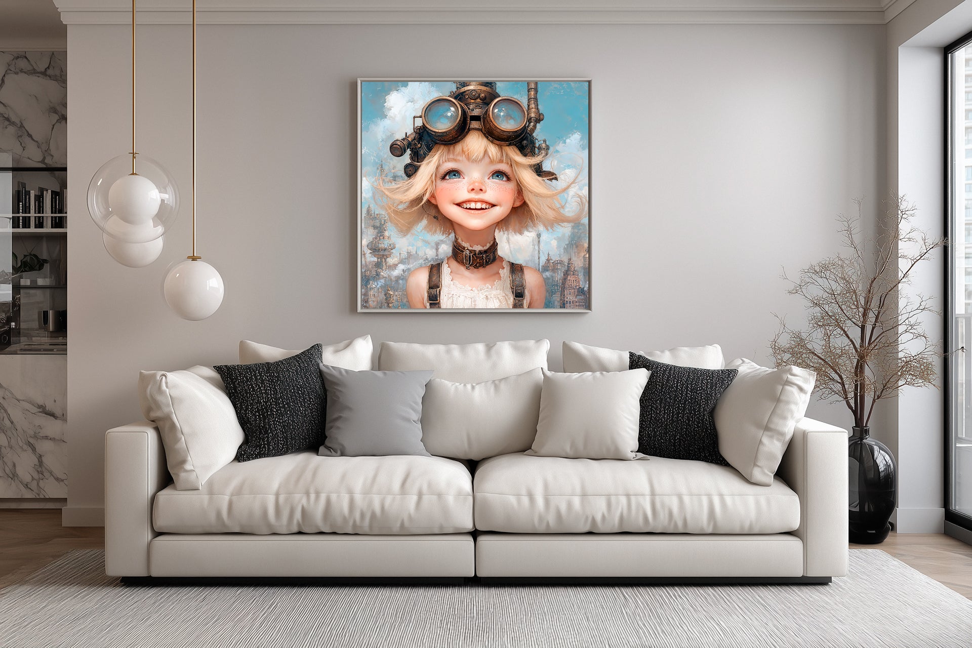 "Little Steampunk No. 25" – Skybound laughter: Wind in her hair, clouds at her back, and wonder in her eyes. With windswept blonde hair and gleaming brass goggles, this joyful young inventor laughs under a bright blue sky filled with fantastical towers and steam.
