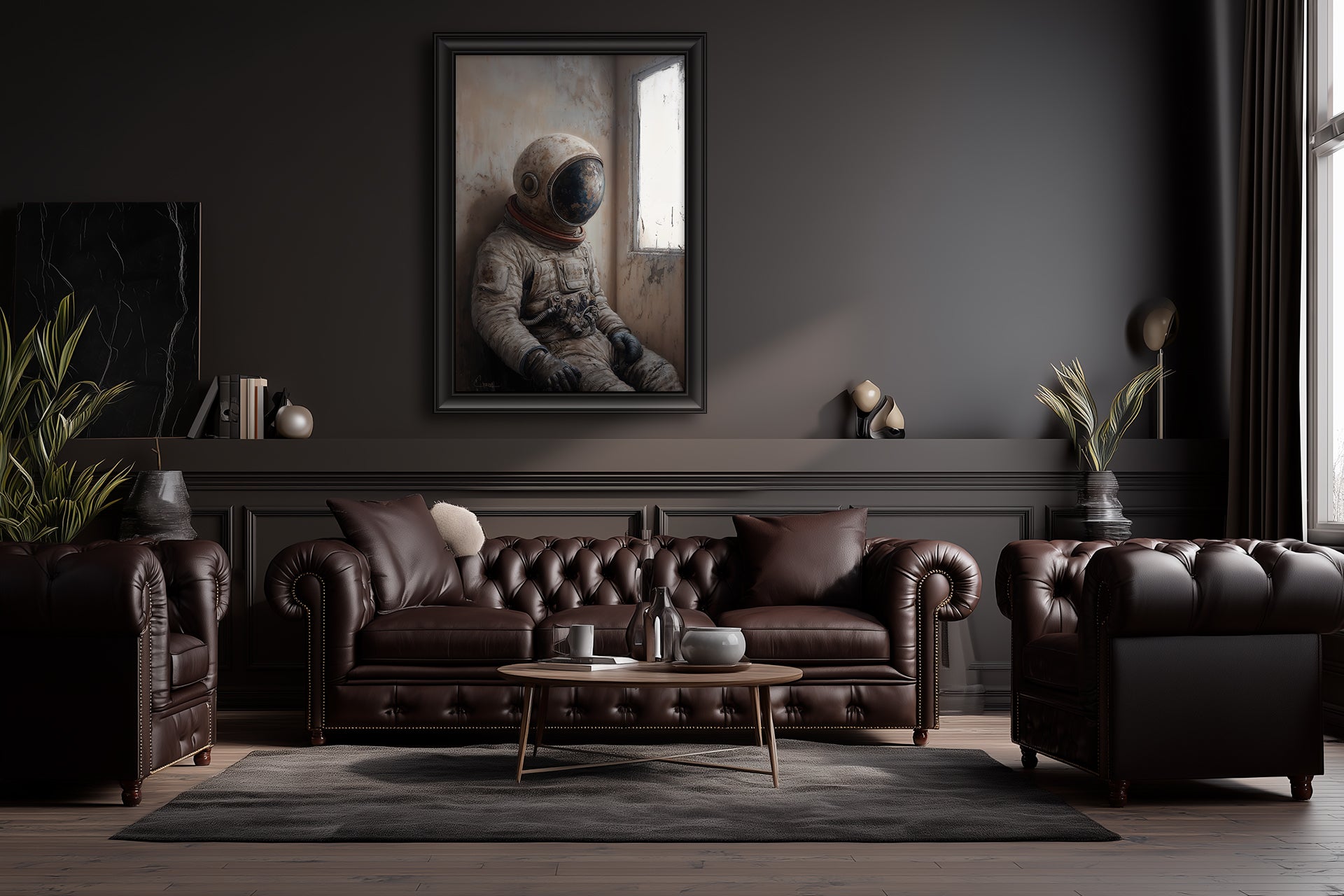 "Marooned No. 3" – Windowless Sky. A weary astronaut stares toward a fractured window, the outside light offering no salvation. Every line in the worn suit speaks of journeys too long endured.