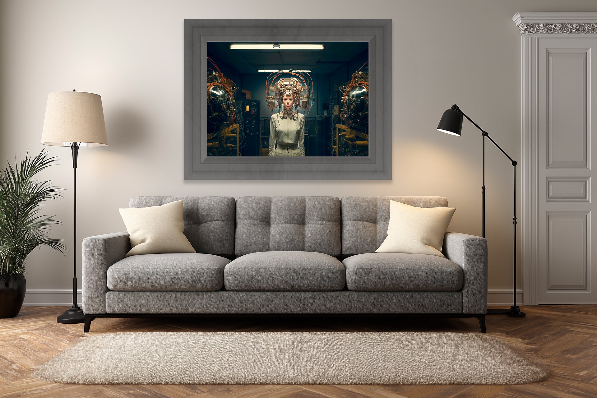 "Meanwhile, back in the lab No. 1" – Subject Zero. A stoic woman stands in the center of a dim lab, adorned with an immense crown of wires and switches, as though crowned by invention itself. Her calm gaze belies the strangeness of the machinery, evoking a sense of ritual and science fused together.