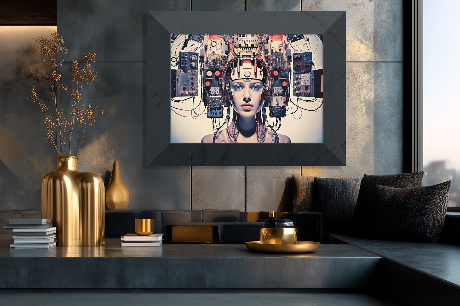 "Meanwhile, back in the lab No. 2" – The Symmetry of Control. A stunningly symmetrical portrait of a woman framed by an overwhelming crown of knobs, switches, and polished steel — a queen of analog technology. Her piercing gaze meets yours, unwavering beneath the controlled chaos of wires and vintage electronics.