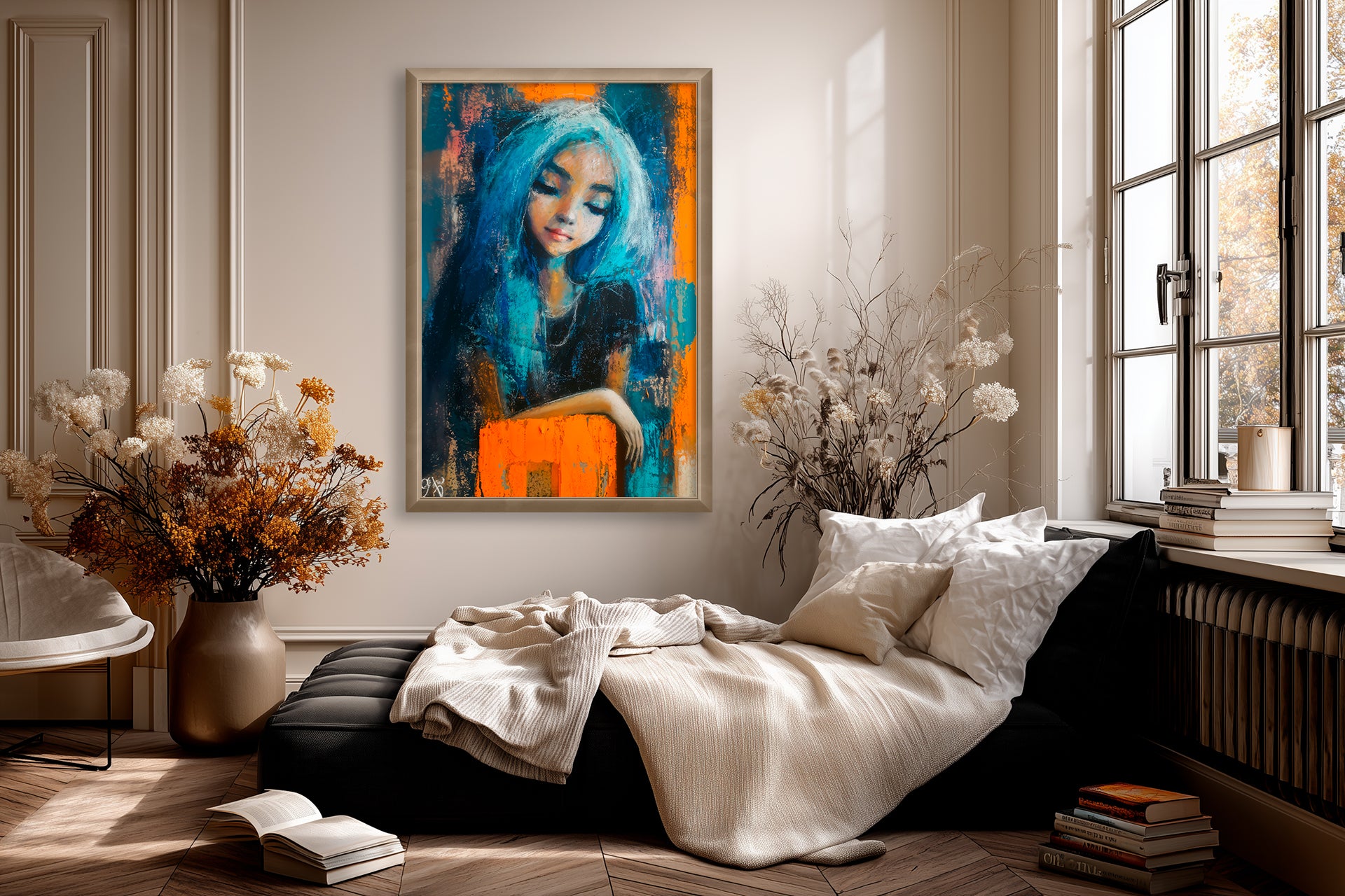 Art Style: This work draws from contemporary figurative expressionism, using loose, textured pastel-like strokes and bold complementary colors. The visible gestural marks evoke the work of Degas’ pastel sketches and modern digital impressionists, blending traditional painterly grit with digital vibrancy. The use of color blocking (deep navy and vivid orange) introduces a design-forward sensibility, echoing elements of post-impressionist Fauvism and street-art abstraction, making it feel simultaneously classic and edgy.