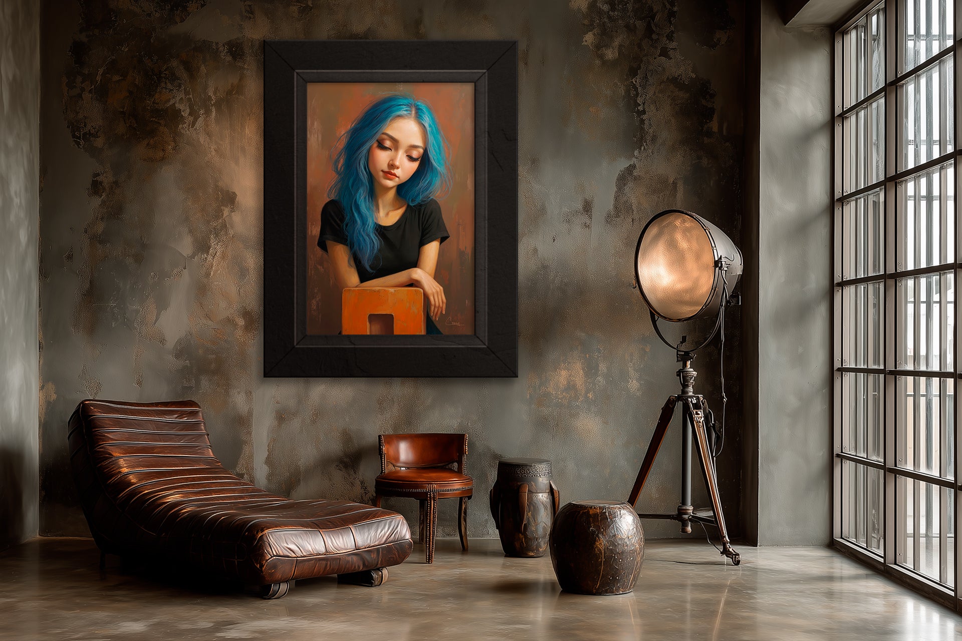 Art Style: This version leans toward contemporary realism with a touch of classical oil portraiture influence. The skin tones and lighting show attention to chiaroscuro, reminiscent of 19th-century portrait masters, but updated with a modern palette and fashion-forward blue hair. The overall finish has a digital oil-painting feel, with a focus on detail and atmosphere that echoes the style of modern figurative realism painters like Alyssa Monks or Jeremy Mann, though with a softer, more serene mood.