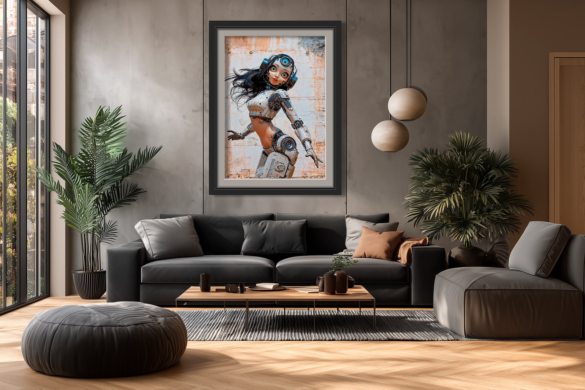 Art Style: This artwork fuses retro-futurism, cybernetic pin-up art, and industrial cyber-aesthetics into a seamless portrait. The meticulous detailing of rivets, plating, and joint mechanisms nods to mid-century science fiction design, while her doll-like features and stylized proportions recall surrealist and pop-art sensibilities. The balance of painterly realism with stylized exaggeration gives the work both cinematic presence and collectible appeal.