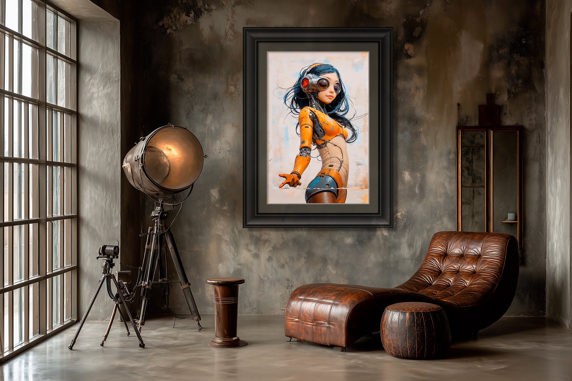 "Partybot No. 6" – Neon Reverie. A sleek fusion of retrofuturist allure and mechanical precision, Party Bot No. 6 radiates an otherworldly elegance. With flowing dark hair and luminous goggles framing her serene face, she balances human softness against polished alloys and weathered plating. The extended gesture of her hand suggests both invitation and mystery—drawing the viewer into a story where humanity and machine merge seamlessly. This piece is as much about intimacy as it is about technology, making it a striking centerpiece for any modern art collection.