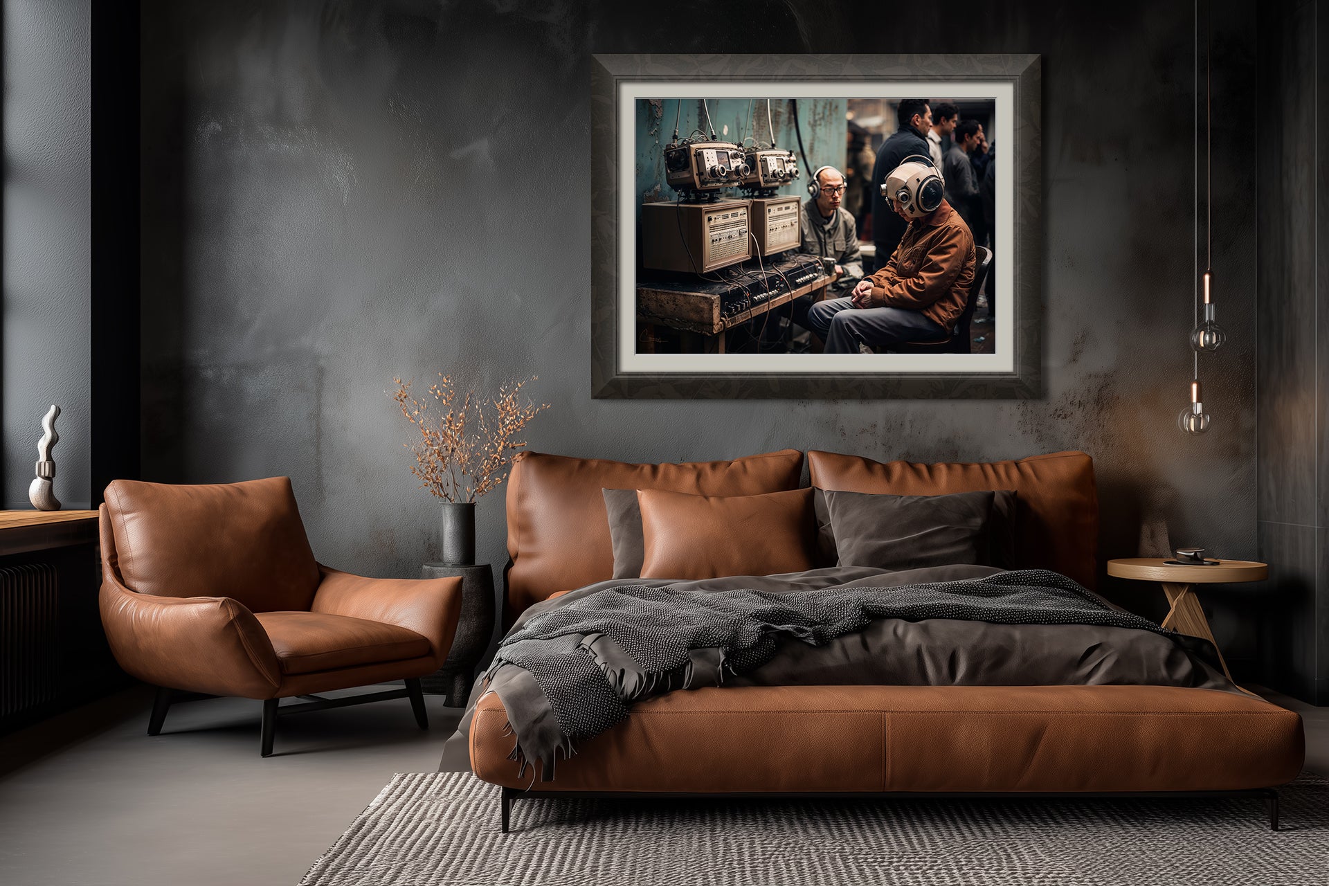 "Postcards from The Unweird No. 4" – Two figures sit among obsolete communication machines, their helmets and wires evoking a time when listening was survival. The scene suggests desperation to connect with voices that may no longer exist.