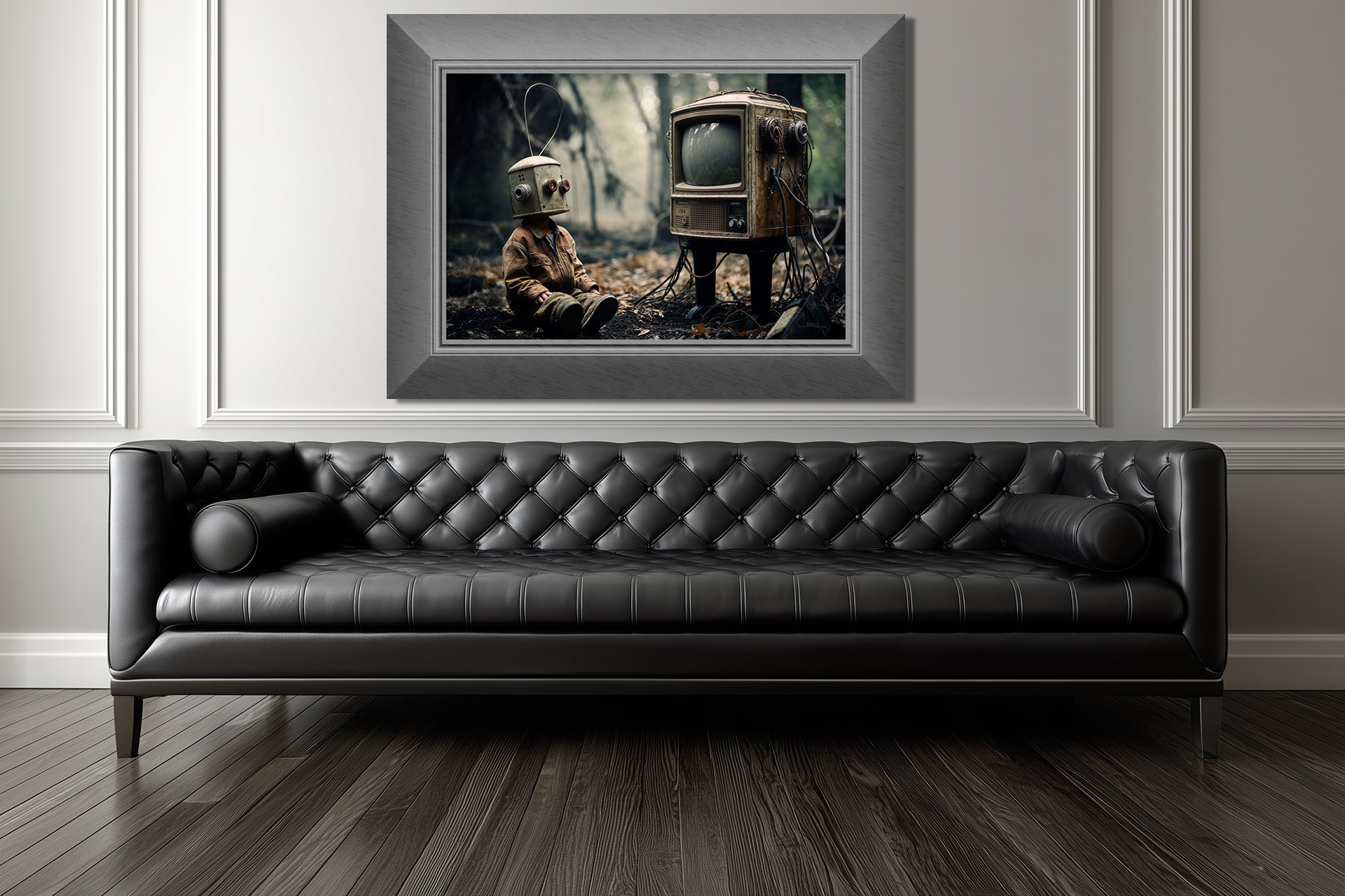 "Postcards from The Unweird No. 6" – A child sits in the woods with a crude metal helmet, staring at an abandoned television patched with lenses and wires. The image balances innocence with unease—nature reclaiming technology.