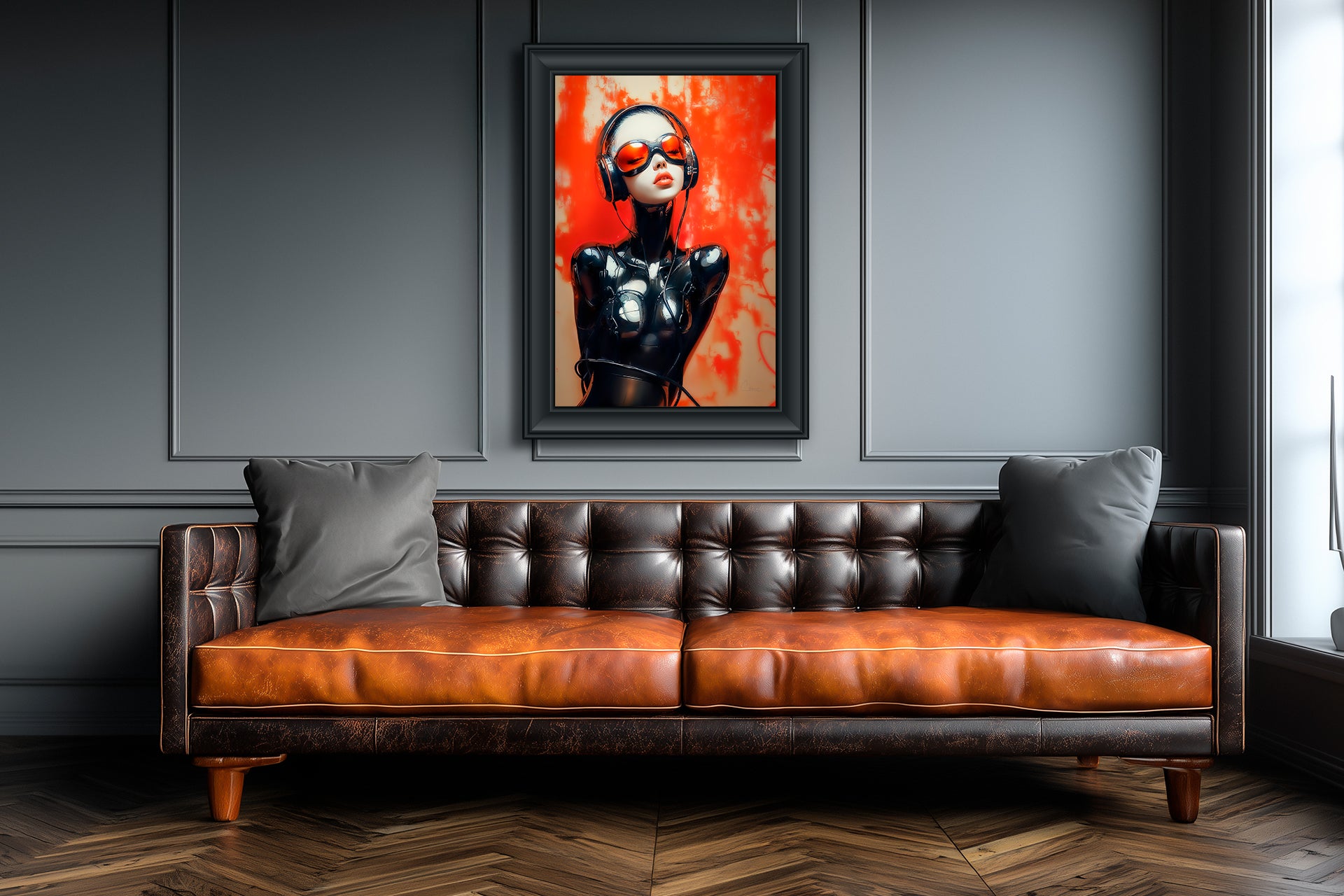 "Prototype No. 10" – Eyes closed in rapture, this prototype embodies pure sound and sensation. The gleaming black surface of her exosuit reflects bold orange light, suggesting synesthetic fusion—part human, part amplifier of the future.