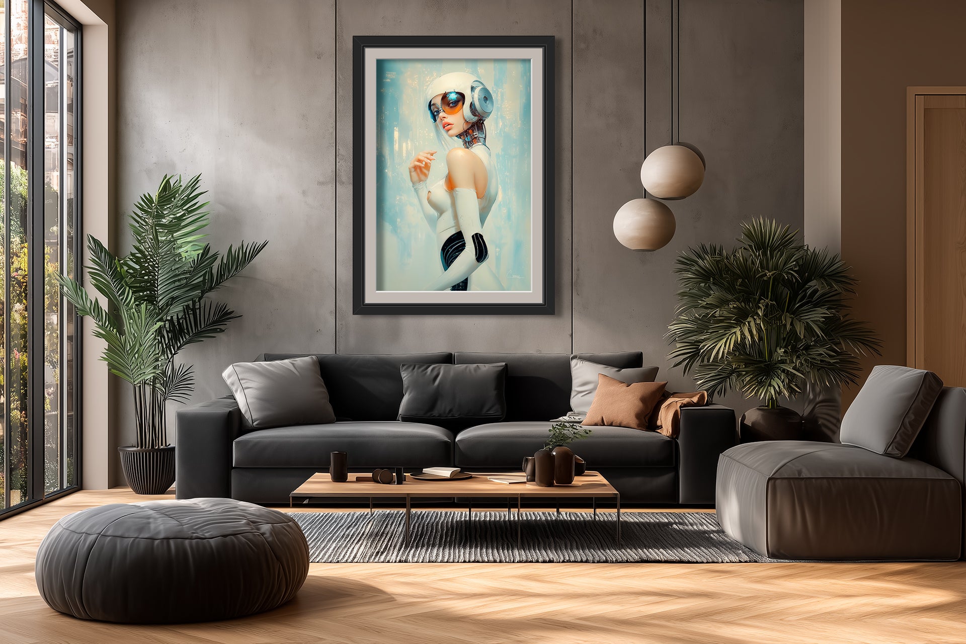 Art Style: Retro-futurist minimalism combined with glossy high-fashion editorial lighting. Influenced by 1960s sci-fi and Kubrickian futurism.