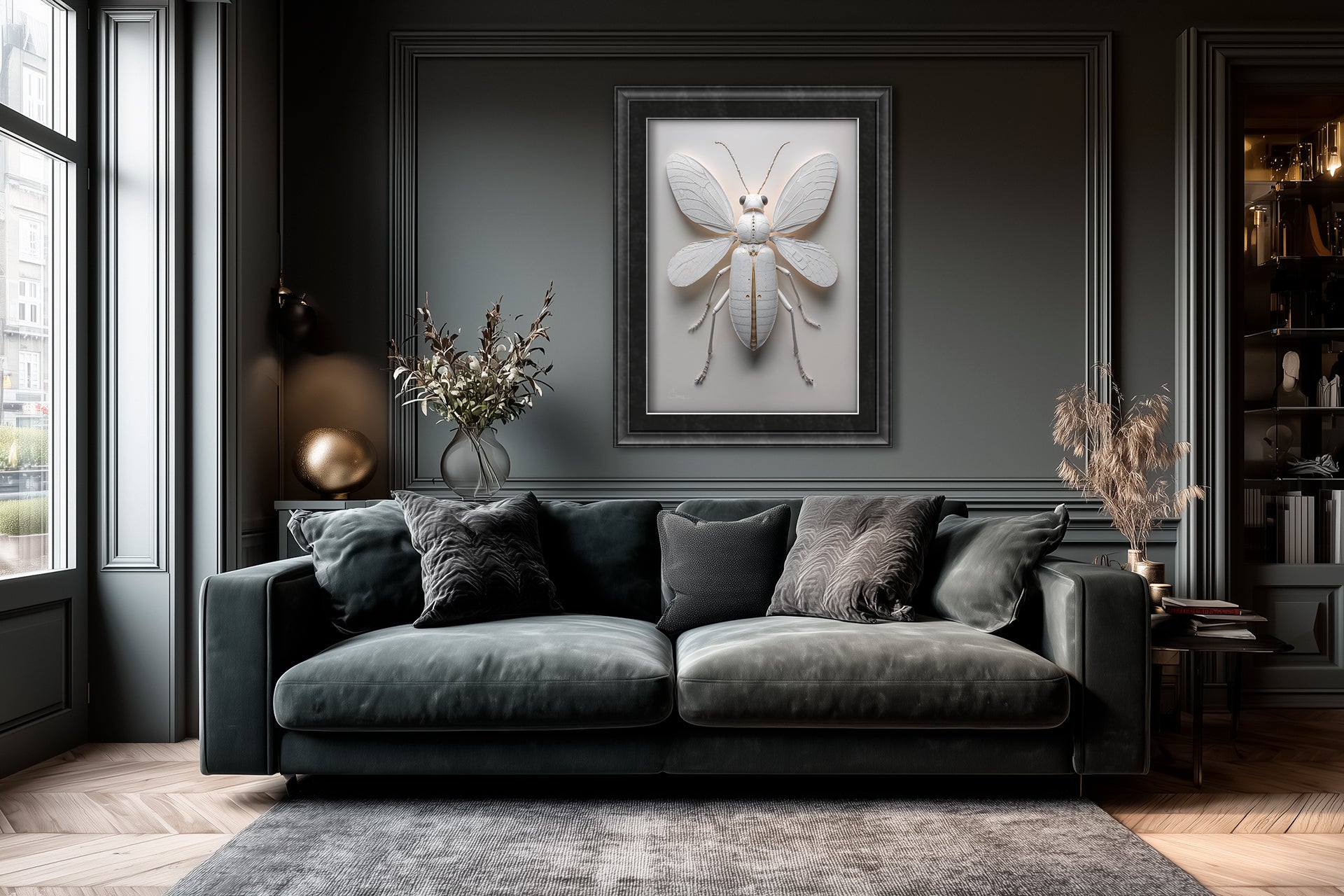 "Pterygota ex Charta No. 2" – Scarab of Paper & Gold. A beetle-like form emerges in stark white, its wings cracked like ancient vellum, its body segmented with architectural precision. This artwork evokes a protective guardian—ancient yet futuristic—preserved in sculptural silence.