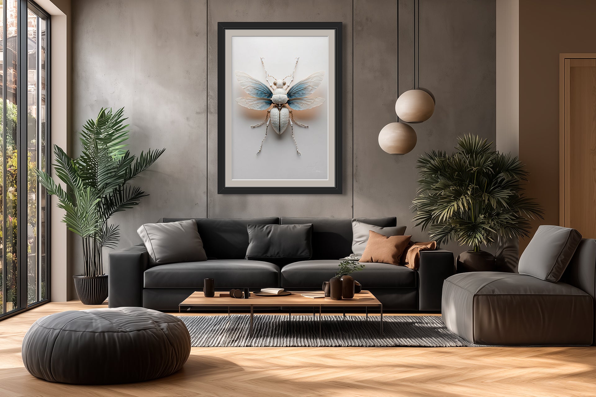 "Pterygota ex Charta No. 3" – Origami Pterygota. This pale insect radiates serenity, its wings fading into a soft blue gradient like twilight skies. The delicacy of its forms and ornamental body details suggest a celestial being caught between worlds—part natural life, part sculptural myth.