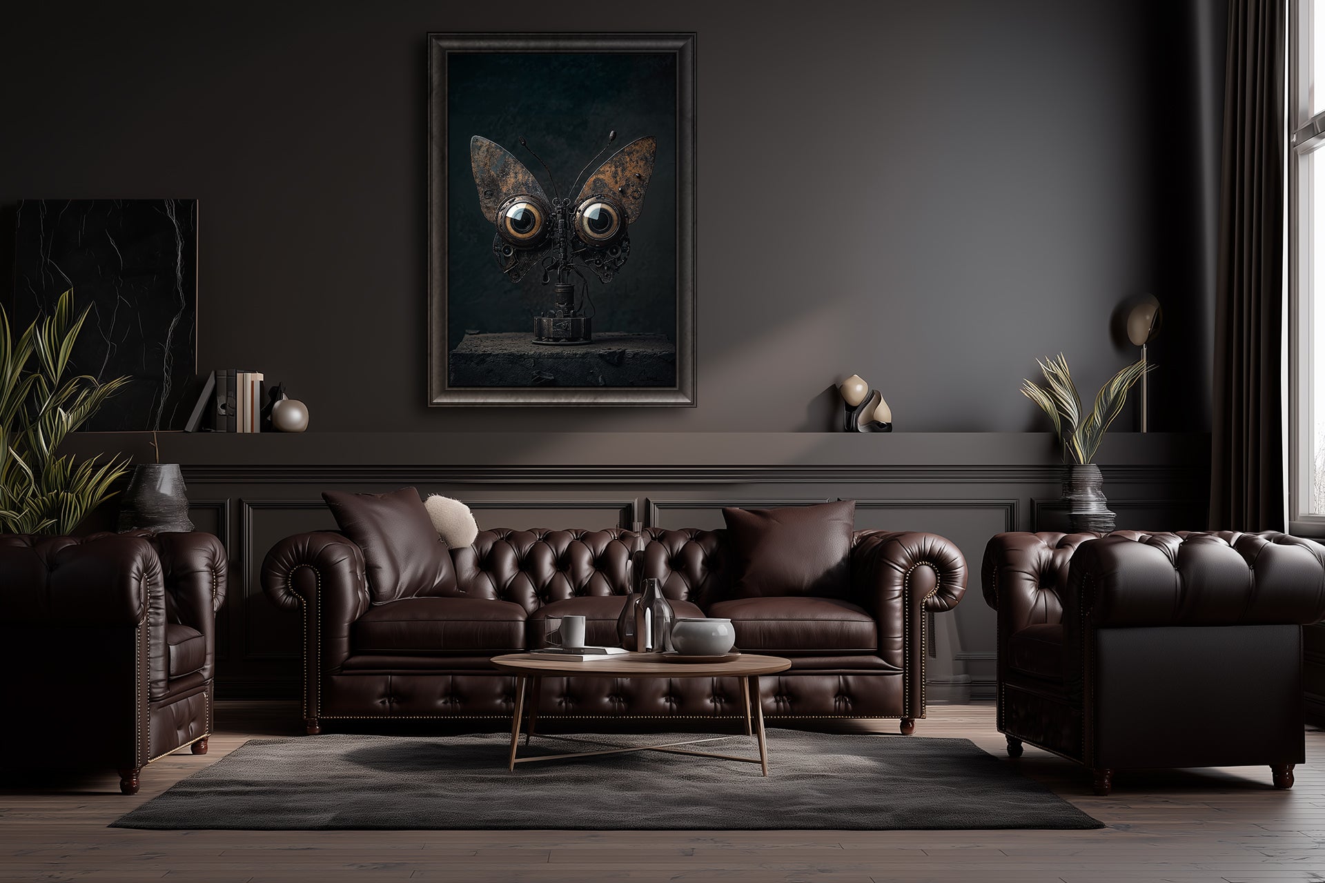 "Pterygota ex Machina No. 4" – Winged Watcher. A butterfly reborn as a strange mechanical observer, its eyes transformed into optical lenses. It stares outward like a sentinel of a forgotten industrial future.