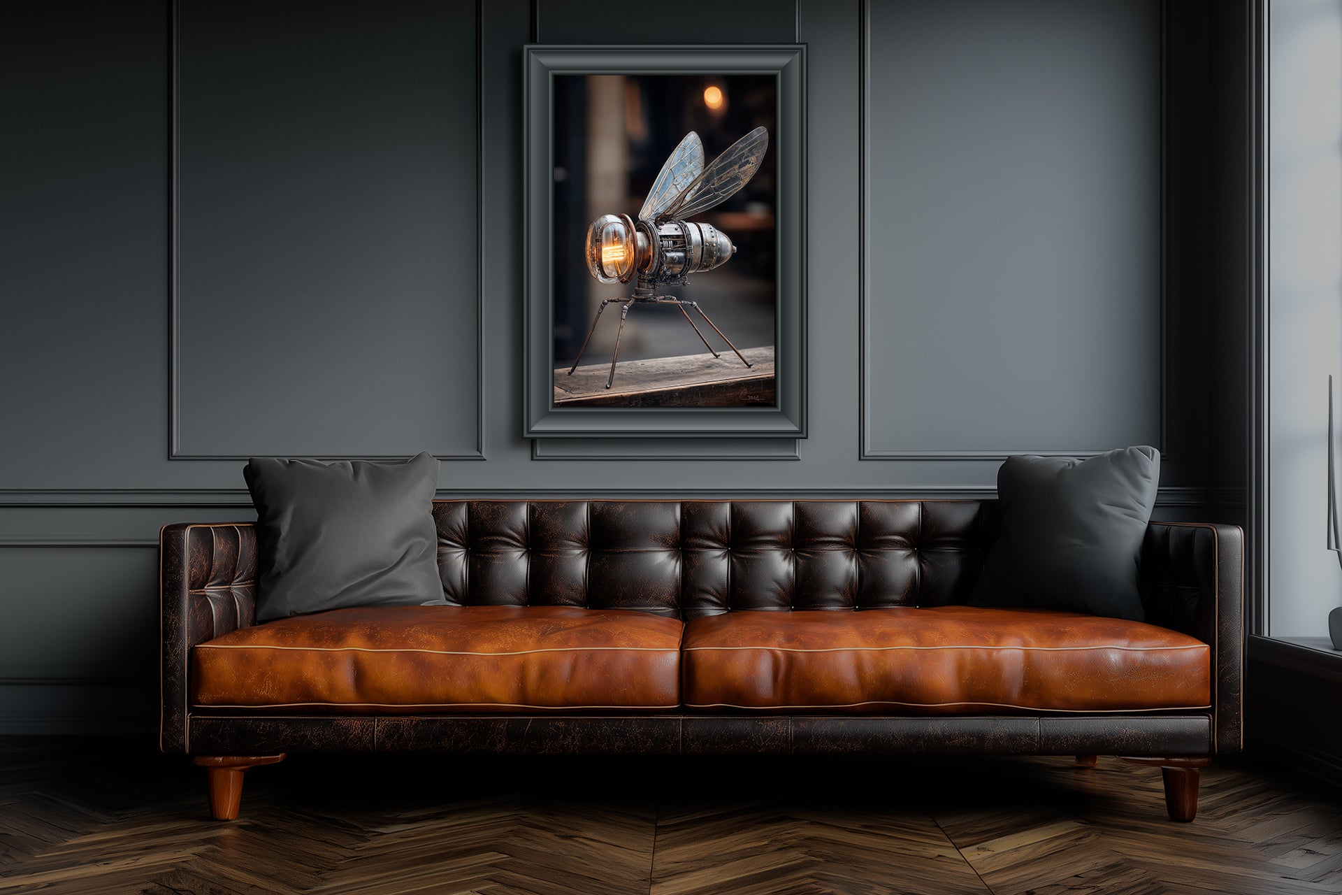 "Pterygota Unweird No. 5" – A fly-like creature with a head that glows like a headlamp, its segmented metallic body and translucent wings making it equal parts machine and insect. It seems designed for night journeys through foggy streets.