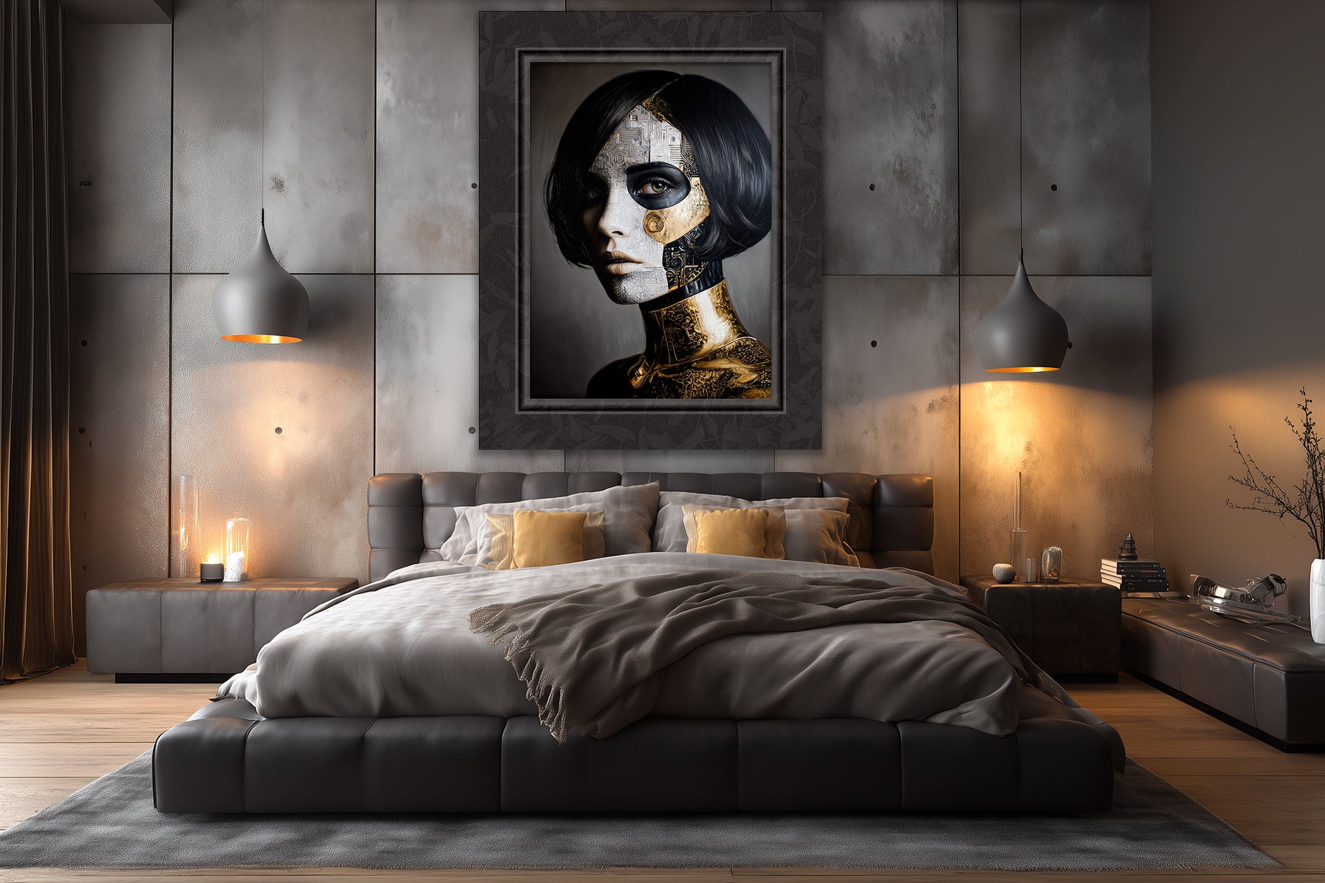 "Retro Deco No. 1" – Gilded Circuitry. A poised android beauty with soft black hair and luminous golden accents. Her face reveals a seamless integration of delicate human features and intricate circuitry, framed in rich black and shimmering gold.