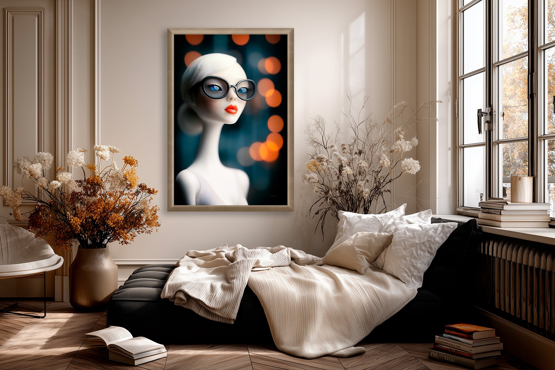 "Sexy Specs No. 2" – Elegant yet aloof, this living doll with a swan-like neck and oversized retro glasses is a vision of cool sophistication. Her crimson lips are the only hint at the fire beneath her poised exterior.
