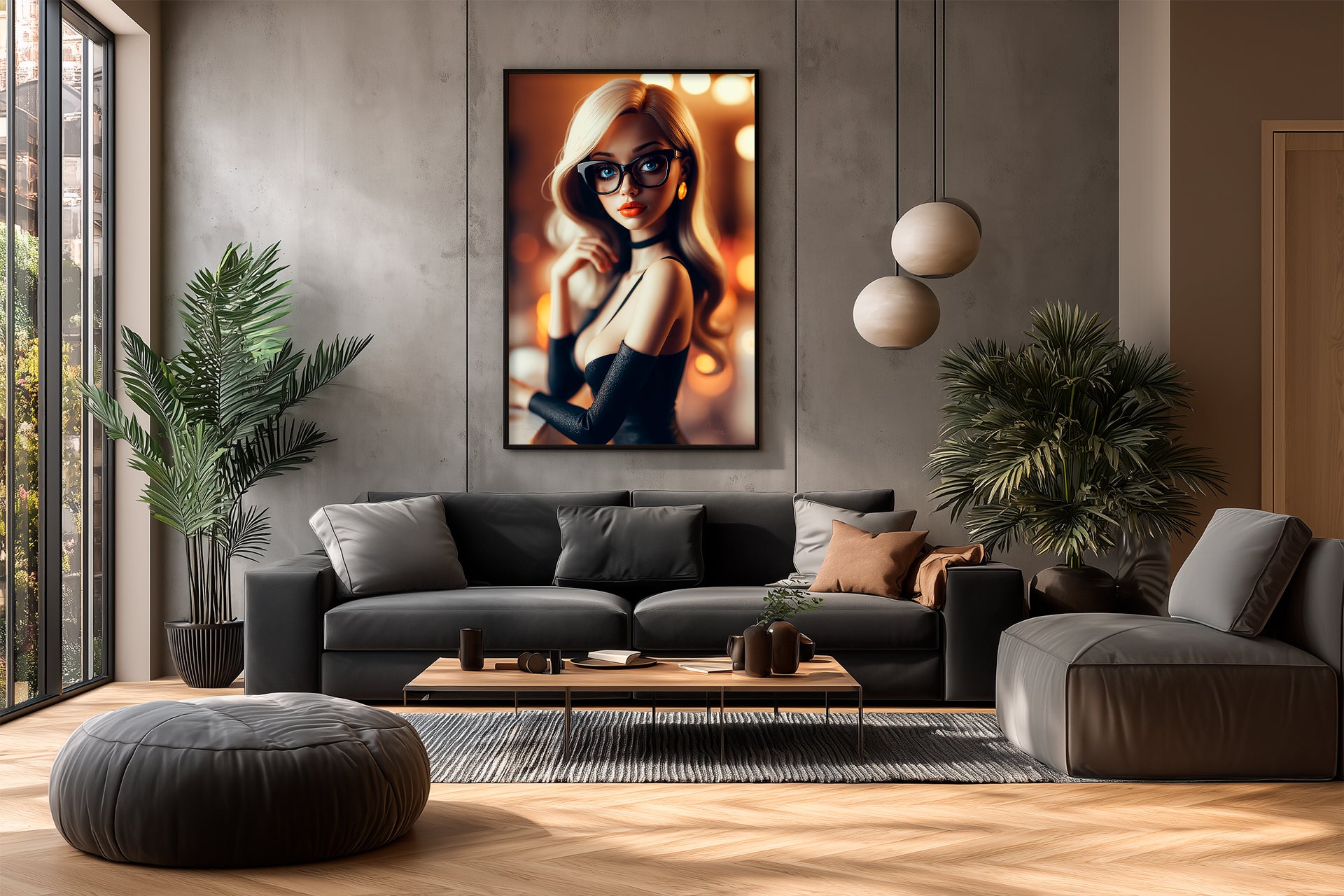 "Sexy Specs No. 6" – With a knowing smirk behind her chic frames, this blonde bombshell leans casually against the bar. Her fitted black dress and long gloves scream Old Hollywood seduction.