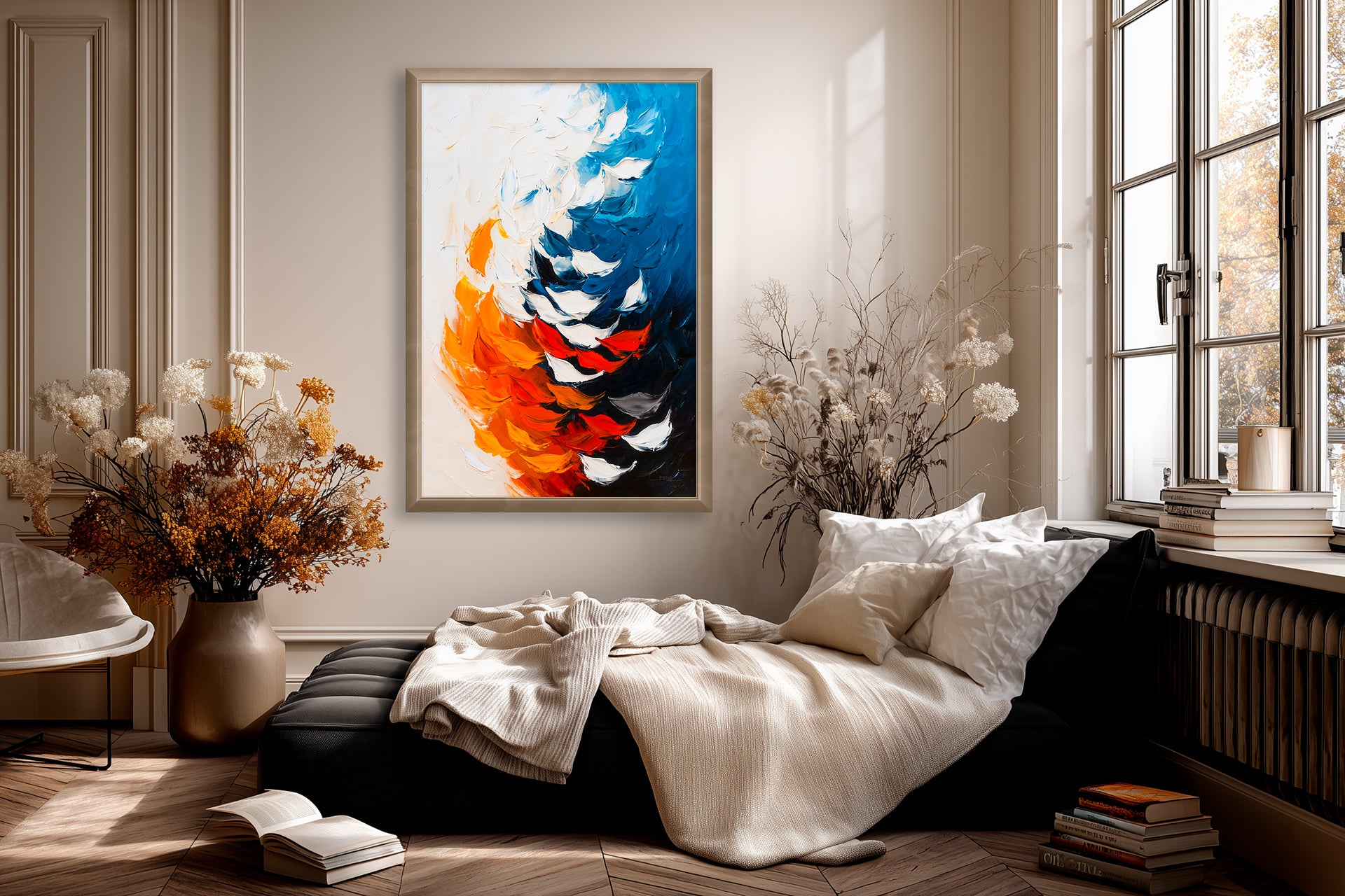 "Shoal of fish No. 1" – Tidal Motion. Shoal of fish No. 1 swirls with expressive brushstrokes of orange, blue, and cream, evoking the ceaseless flow of ocean currents. A vibrant work from Nature Reimagined: Abstract Forms, it captures movement with painterly intensity.