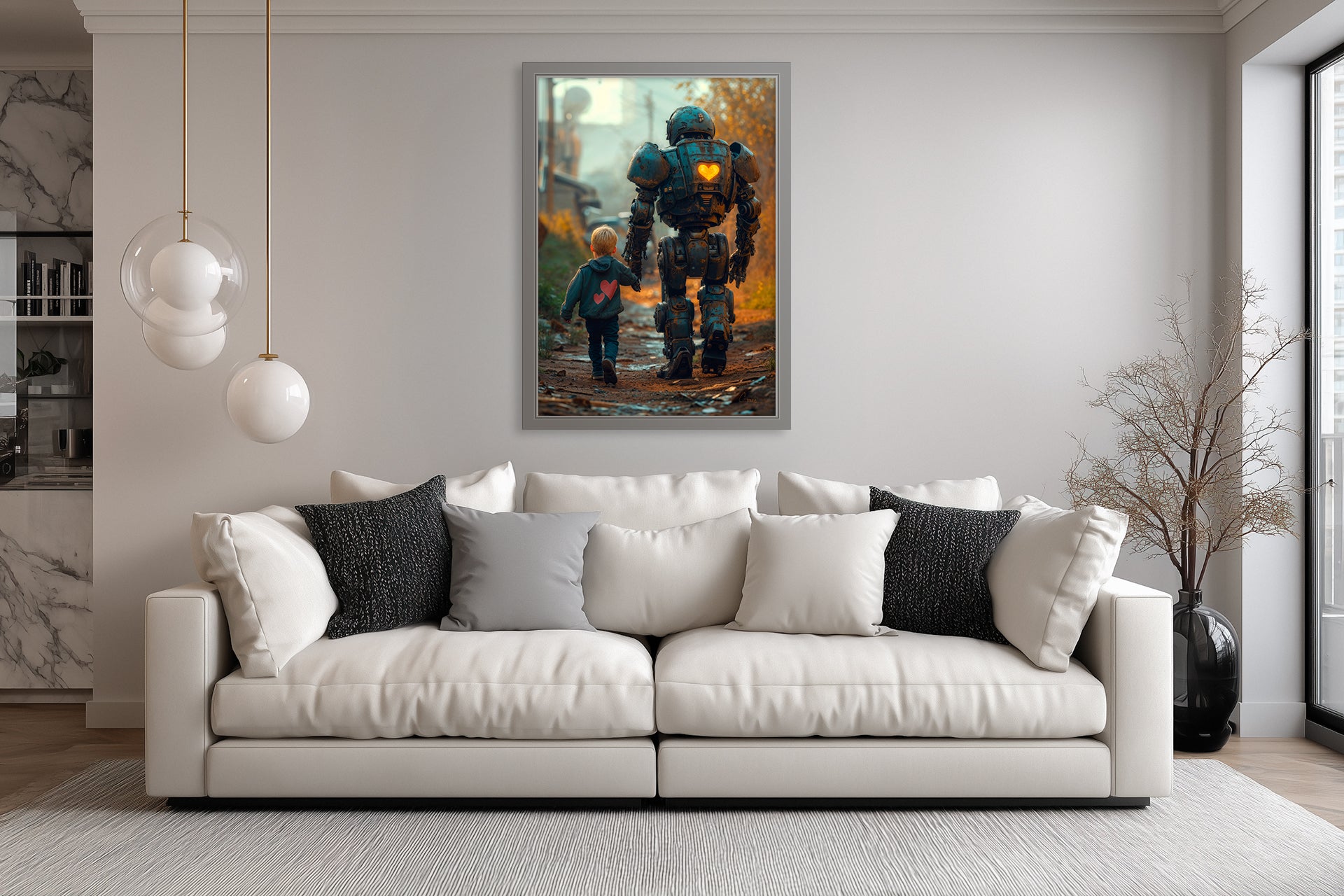 "Something to watch over me No. 1" – BFF. Side by side, boy and robot stride down a dirt road. Both wear their hearts openly—one stitched on cloth, one glowing through steel. It’s a simple yet moving portrayal of companionship without boundaries.