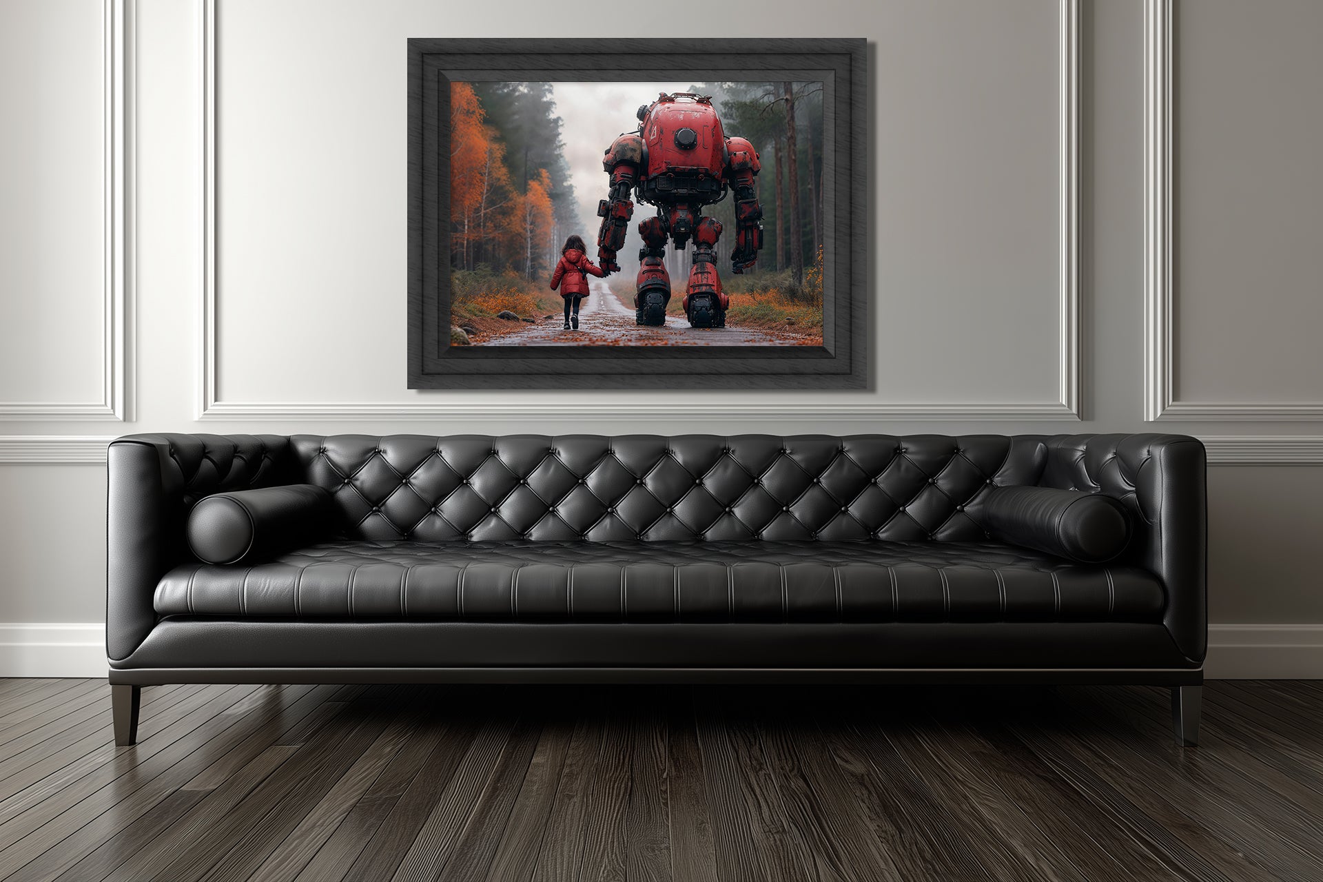"Something to watch over me No. 12" – Through a misty autumn road, a girl in a bright red coat walks hand in hand with her equally red robot companion. Their mirrored colors symbolize unity and belonging.