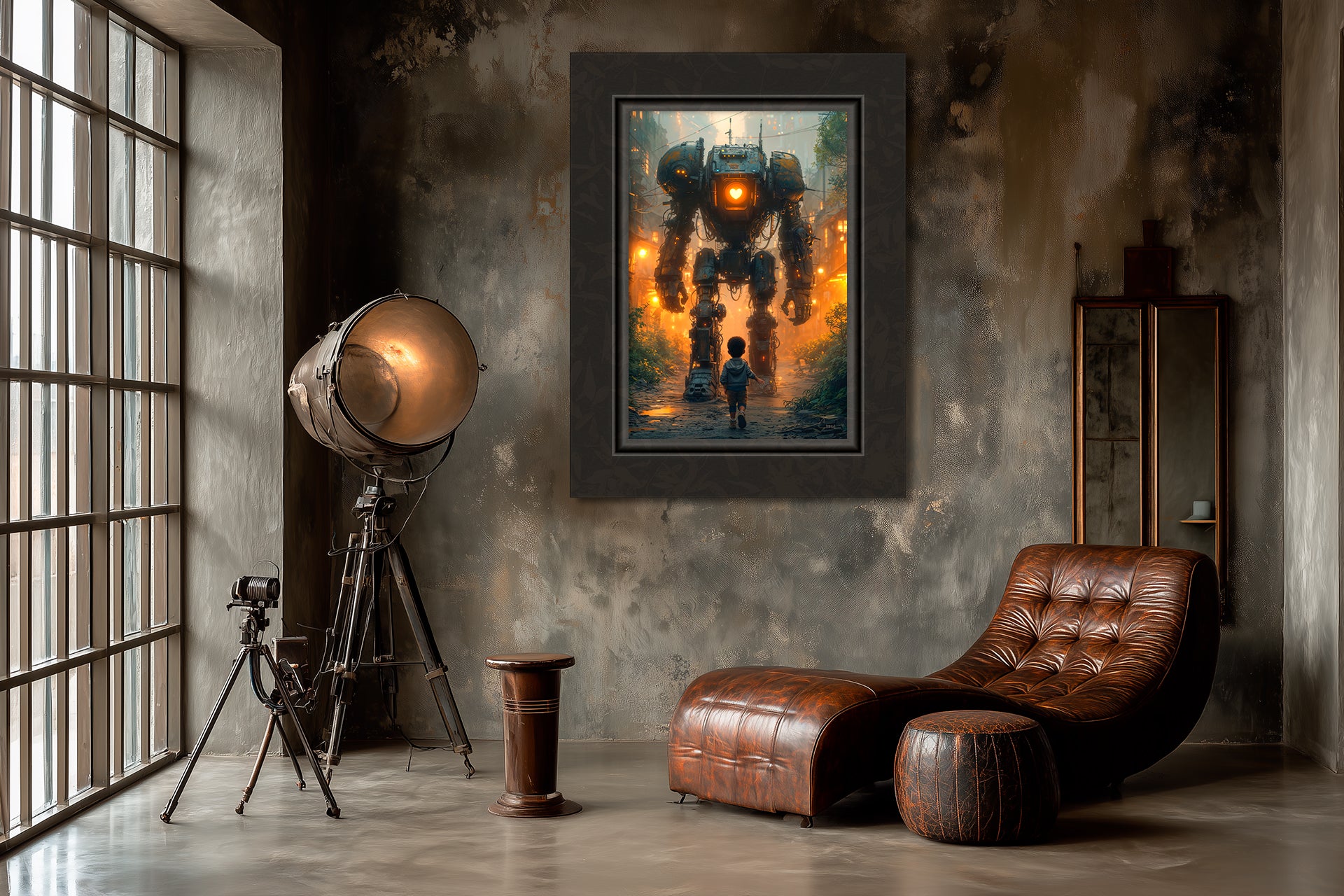 "Something to watch over me No. 3" – Amid flickering lanterns and decayed buildings, a boy gazes up at his watchful protector. The heart of the machine shines brighter than the city’s lights—a beacon of loyalty in a world gone dim.
