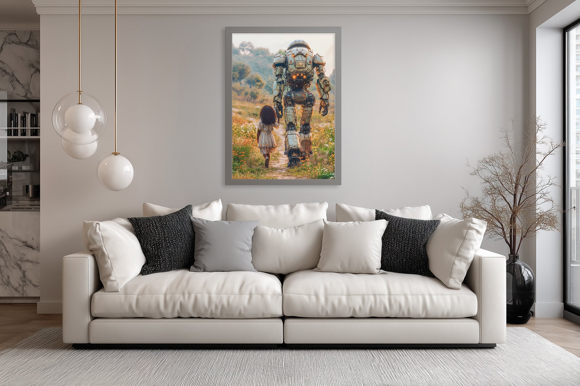 "Something to watch over me No. 5" – Shepherd’s Heart. Against a wildflower meadow, a girl in a delicate dress holds hands with her hulking mechanical guardian. The contrast between fragile beauty and armored might creates a moving meditation on protection and innocence.