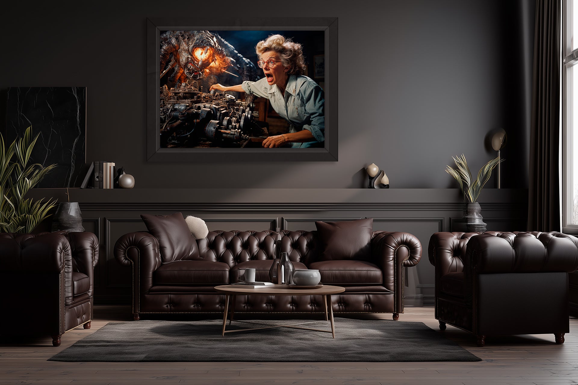 Art Style: Creature-feature pulp horror meets retro-lab realism; exaggerated expressions and dramatic lighting create a campy yet thrilling scene.