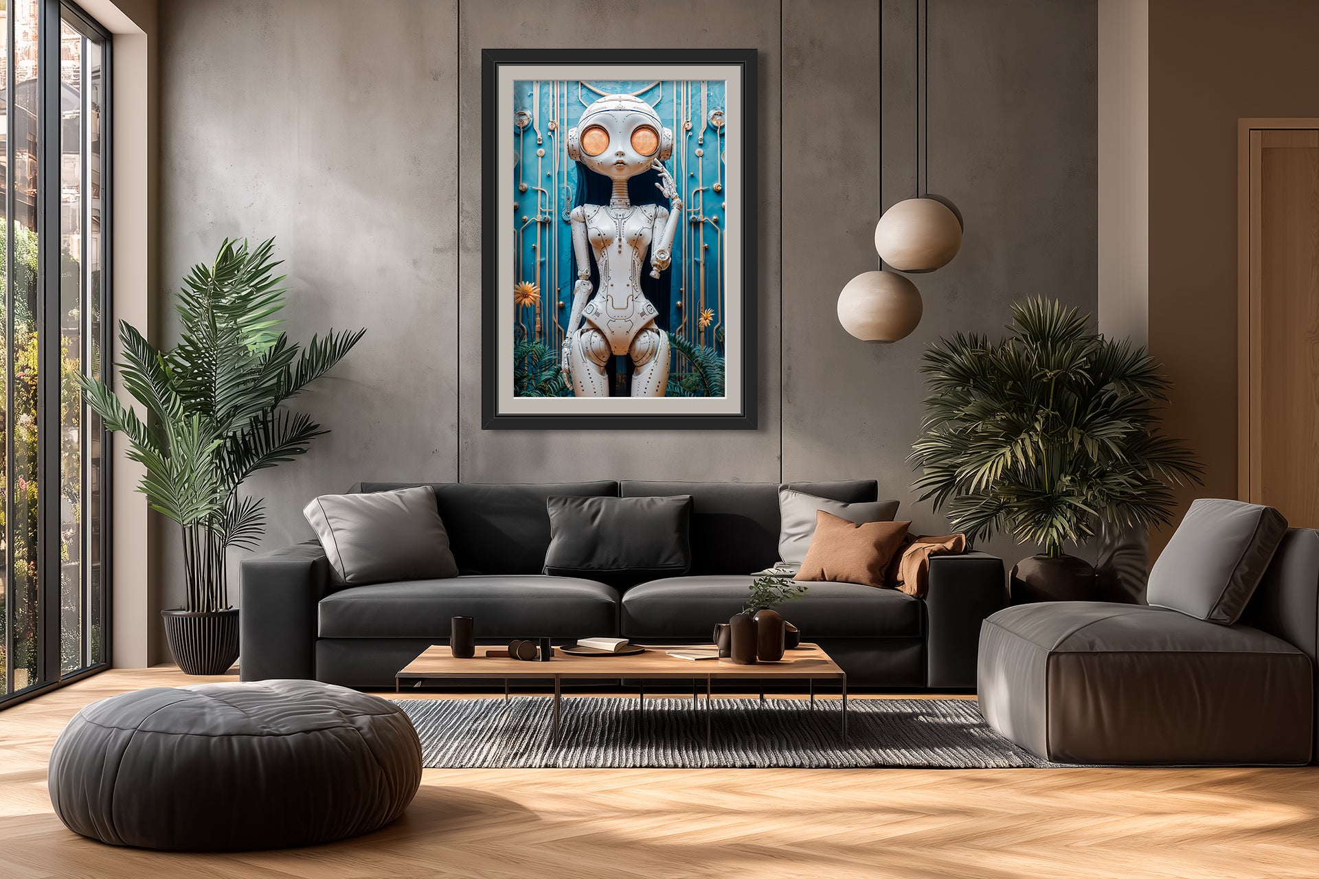 "Strangely Beautiful No. 1" – She Devil - Chrysalis of Desire. Framed against a blue-and-gold architectural wall, she recalls the sacred geometry of a temple statue. Her vast golden eyes radiate warmth yet conceal her intent, an android priestess caught between mechanical perfection and the quiet mystery of human longing.