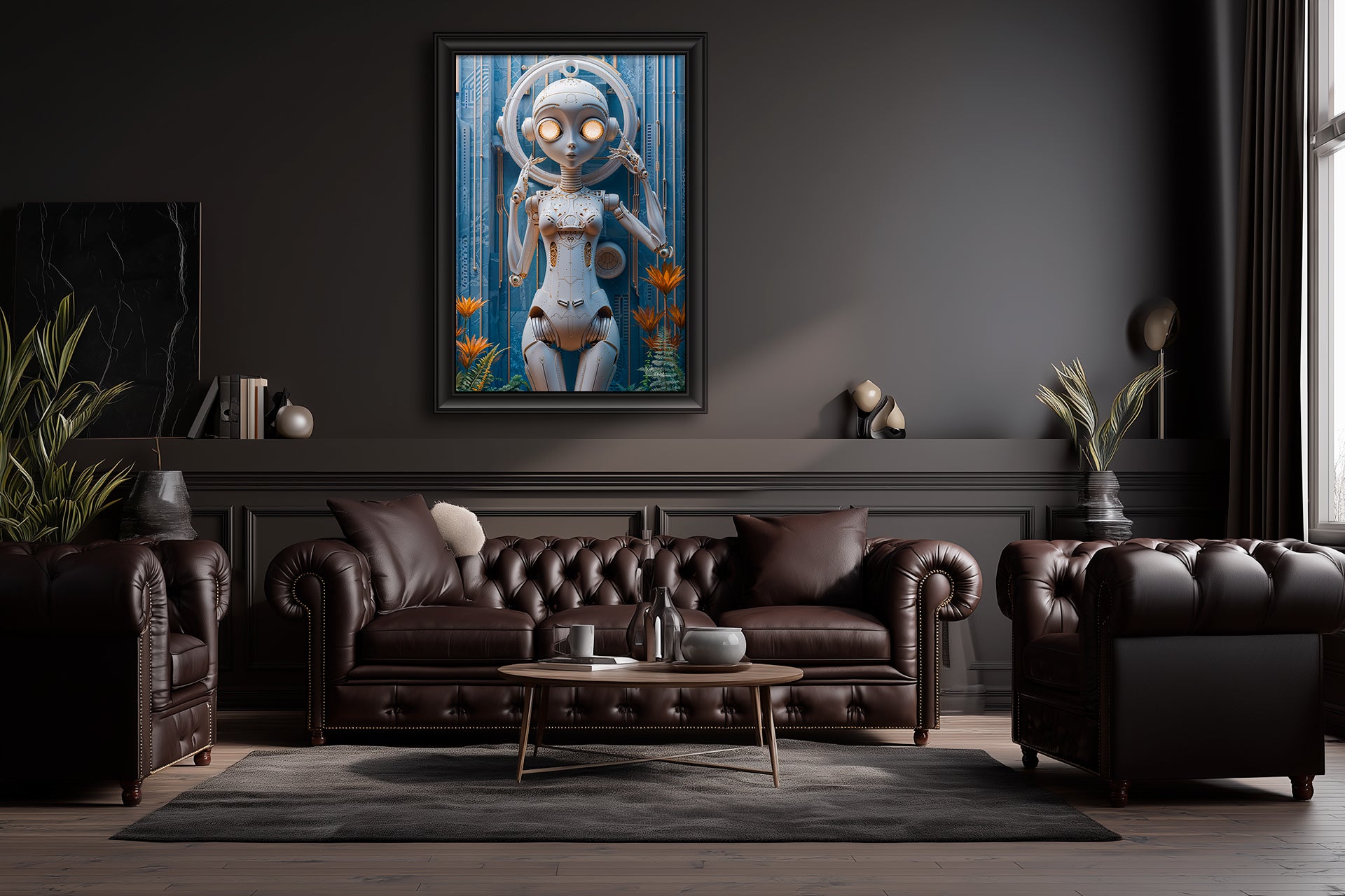 "Strangely Beautiful No. 10" – Poised with delicate gesture and wide illuminated eyes, this android is less seductress and more celestial child. She glows with innocence and awe, a paradox within a collection that otherwise smolders with desire.